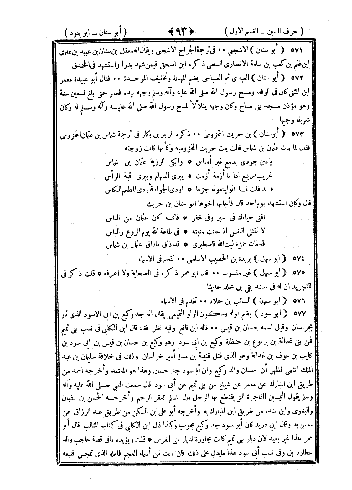 <93> أبو سنان الأشجعي في ترجمة الجراح الأشجعي ويقال إنه معقل بن سنان والراجح أنه غيره أبو سنان بن صيفي بن صخر بن خنساء بن سنان بن عبيد بن عدي بن غنم بن كعب بن سلمة الأنصاري السلمي ذكره بن إسحاق فيمن شهد بدرا واستشهد في الخندق أبو سنان العبدي ثم الصباحي بضم المهملة وتخفيف الموحدة قال أبو عبيدة معمر بن المثنى كان في الوفد ومسح رسول الله صلى الله عليه وسلم وجهه بيده فعمر حتى بلغ تسعين سنة وهو مؤذن مسجد بني صباح وكان وجهه يتلألأ لمسح رسول الله صلى الله عليه وسلم له وكان شريفا وجيها أبو سنان بن حريث المخزومي ذكره الزبير بن بكار في ترجمة شماس بن عثمان المخزومي فقال لما مات عثمان بن شماس قالت بنت حريث المخزومية المخزومية وكأنها كانت زوجته يا عين جودي بدمع غير إبساس وابكي رزية عثمان بن شماس صعب البديهة ميمون نقيبته حمال ألوية ركاب أفراس غريب مريع إذا ما أزمة أزمت يبري السهام ويبري قبة الراس قد قلت لما أتوا ينعونه جزعا أودى الجواد فأردى المطعم الكاسي قال وكان استشهد يوم أحد قال فأجابها أخوها أبو سنان بن حريث اقنى حياءك في ستر وفي خفر فإنما كان عثمان من الناس لا تقتلي النفس إن حانت منيته في طاعة الله يوم الروع والباس قد مات حمزة ليث الله فاصطبري قد ذاق ما ذاق عثمان بن شماس أبو سهل بريدة بن الحصيب الأسلمي تقدم في الأسماء أبو سهل غير منسوب قال أبو عمر ذكر في الصحابة ولا أعرفه قلت ذكر في التجريد أنه له في مسند بقي بن مخلد حديثا أبو سهلة السائب بن خلاد تقدم في الأسماء أبو سود بضم أوله وسكون الواو التميمي يقال إنه جد وكيع بن أبي سود الذي ثار بخراسان وقيل اسمه حسان بن قيس قاله بن قانع وفيه نظر فقد قال بن الكلبي في نسب بني تميم فمن بني غدانة بن يربوع بن حنظلة وكيع بن أبي سود وهو وكيع بن حسان بن قيس بن أبي سود بن كلب بن عوف بن نابل بن عوف بن غدانة وهو الذي قتل قتيبة بن مسلم أمير خراسان وذلك في خلافة سليمان بن عبد الملك انتهى فظهر أن حسان والد وكيع وأن أبا سود جد حسان وهذا هو المعتمد وأخرجه أحمد من طريق بن المبارك عن معمر عن شيخ من بني تميم عن أبي سود قال سمعت النبي صلى الله عليه وسلم يقول اليمين الفاجرة التي يقتطع بها الرجل مال المسلم تعقم الرحم وأخرجه الحسن بن سفيان والبغوي وابن منده من طريق بن المبارك به وأخرجه أبو علي بن السكن من طريق عبد الرزاق عن معمر به وقال بن دريد كان أبو سود جد وكيع مجوسيا وكذا قال بن الكلبي في كتاب المثالب قال أبو عمر هذا غير بعيد لأن ديار بني تميم كانت مجاورة لديار الفرس قلت ويؤيده ما في قصة حاجب والد عطارد بل في نسب أبي سود هذا ما يدل على ذلك فإن بابك من أسماء العجم فلعله الذي تمجس فتبعه §