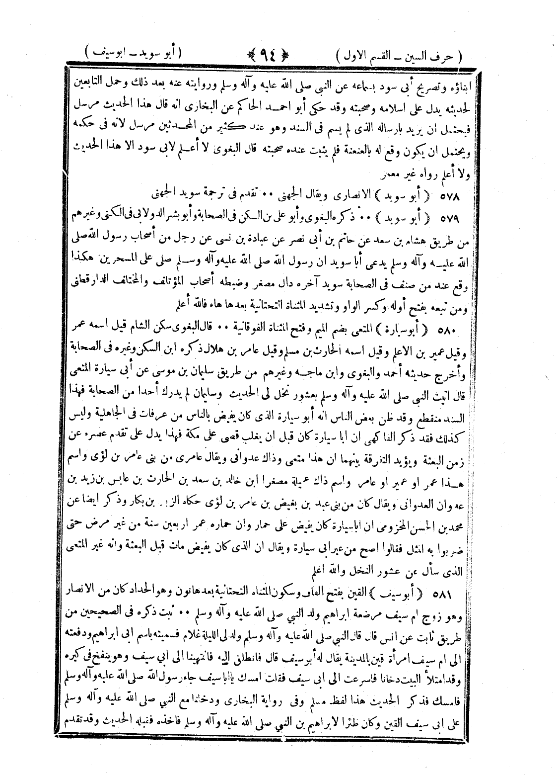 <94> أبناؤه وتصريح أبي سود بسماعه من النبي صلى الله عليه وسلم وروايته عنه بعد ذلك وحمل التابعين لحديثه يدل على إسلامه وصحبته وقد حكى أبو أحمد الحاكم عن البخاري أنه قال هذا الحديث مرسل فيحتمل أن يريد بإرساله الذي لم يسم في السند وهو عند كثير من المحدثين مرسل أنه في حكمه ويحتمل أن يكون وقع له بالعنعنة فلم يثبت عنده صحبته قال البغوي لا أعلم لأبي سود إلا هذا الحديث ولا أعلم رواه غير معمر أبو سويد الأنصاري ويقال الجهني تقدم في ترجمة سويد الجهني في الأسماء أبو سويد ذكره البغوي وأبو علي بن السكن في الصحابة وأبو بشر الدولابي في الكنى وغيرهم من طريق هشام بن سعد عن حاتم بن أبي نصر عن عبادة بن نسي عن رجل من أصحاب رسول الله صلى الله عليه وسلم يدعى أبا سويد أن رسول الله صلى الله عليه وسلم صلى على المتسحرين هكذا وقع عند من صنف في الصحابة سويد آخره دال مصغر وضبطه أصحاب المؤتلف والمختلف الدارقطني ومن تبعه بفتح أوله وكسر الواو وتشديد المثناة التحتانية بعدها هاء فالله أعلم أبو سيارة المتعي بضم الميم وفتح المثناة الفوقانية قال البغوي سكن الشام قيل اسمه عمرو وقيل عمير بن الأعلم وقيل اسمه الحارث بن مسلم وقيل عامر بن هلال ذكره بن السكن وغيره في الصحابة وأخرج حديثه أحمد والبغوي وابن ماجة وغيرهم من طريق سليمان بن موسى عن أبي سيارة المتعى قال أتيت النبي صلى الله عليه وسلم بعشور نحل لي الحديث وسليمان لم يدرك أحدا من الصحابة فهذا لسند منقطع وقد ظن بعض الناس أنه أبو سيارة الذي كان يفيض بالناس من عرفات في الجاهلية وليس كذلك فقد ذكر الفاكهي أن أبا سيارة كان قبل أن يغلب قصي على مكة فهذا يدل على تقدم عصره على زمن البعثة ويؤيد التفرقة بينهما أن هذا متعي وذاك عدواني ويقال عامري من بني عامر بن لؤي واسم هذا عمرو أو عمير أو عامر واسم ذاك عميلة مصغرا بن الأعزل بن خالد بن سعد بن الحارث بن قابس بن زيد بن عدوان العدواني ويقال كان من بني عبد بن بغيض بن عامر بن لؤي وكان بحيز بقيس من عرفة لأنهم كانوا أخواله حكاه الزبير بن بكار وذكر أيضا عن محمد بن الحسن المخزومي أن أبا سيارة كان يفيض على حمار وأن حماره عمر أربعين سنة من غير مرض حتى ضربوا به المثل فقالوا أصح من عير أبي سيارة ويقال إن الذي كان يفيض مات قبل البعثة وأنه غير المتعى الذي سأل عن عشور النحل والله أعلم أبو سيف القين بفتح القاف وسكون المثناة التحتانية بعدها نون وهو الحداد كان من الأنصار وهو زوج أم سيف مرضعة إبراهيم ولد النبي صلى الله عليه وسلم ثبت ذكره في الصحيحين من طريق ثابت عن أنس قال قال النبي صلى الله عليه وسلم ولد لي الليلة غلام فسميته باسم أبي إبراهيم ودفعته الى أم سيف امرأة قين بالمدينة يقال له أبو سيف قال فانطلق اليه فانتهينا الى أبي سيف وهو ينفخ في كيره وقد امتلأ البيت دخانا فأسرعت الى أبي سيف فقلت أمسك يا أبا سيف جاء رسول الله صلى الله عليه وسلم فأمسك فذكر الحديث هذا لفظ مسلم وفي رواية البخاري ودخلنا مع النبي صلى الله عليه وسلم على أبي سيف القين وكان ظئرا لإبراهيم بن النبي صلى الله عليه وسلم فأخذه فقبله الحديث وقد تقدم §
