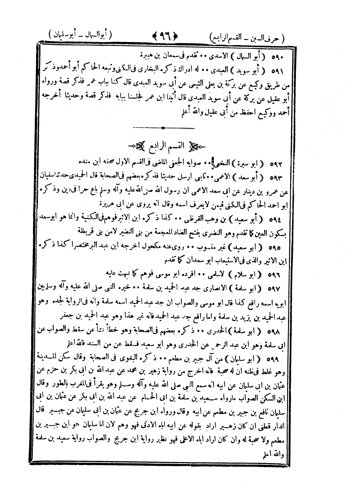 <96> أبو السمال الأسدي تقدم في سمعان بن هبيرة أبو سويد العبدي له إدراك ذكره البخاري في الكنى وتبعه الحاكم أبو أحمد وذكره من طريق وكيع عن بركة بن يعلى التيمي عن أبي سويد العبدي قال كنا بباب عمر فذكر قصة ورواه أبو عقيل عن بكرة عن أبي سويد العبدي قال أتينا بن عمر فجلسنا ببابه فذكر قصة وحديثا أخرجه أحمد ووكيع أحفظ من أبي عقيل والله أعلم القسم الرابع أبو سبرة النخعي صوابه الجعفي الماضي في القسم الأول صحفه بن منده أبو سعد الأعمى تابعي أرسل حديثا فذكره بعضهم في الصحابة قال الحميدي حدثنا سفيان عن عمرو بن دينار عن أبي سعيد الأعمى قال سفيان وحدثنا بن عطاء عن أبيه عن أبي سعد الأعمى أن رسول الله صلى الله عليه وسلم باع حرا في دين وذكره أبو أحمد الحاكم في الكنى فيمن لا يعرفه اسمه وقال إنه يروي عن أبي هريرة أبو سعيد بن وهب القرظي كذا ذكره بن الأثير فوهم في الكنية وإنما هو أبو سعد بسكون العين كما تقدم وهو النضري بفتح الضاد المعجمة من بني النضير لا من بني قريظة أبو سعيد غير منسوب روى عنه مكحول أخرجه بن عبد البر مختصرا كذا ذكره بن الأثير والذي في الاستيعاب أبو سعدان كما تقدم أبو سفينة الحارث بن عمرو السهمي كذا وقع في الكمال لعبدالغني وأقره المزي والصواب أبو مسقبة وسيأتي في الميم أبو سلام الأسلمي أفرده أبو موسى فوهم كما نبهت عليه أبو سلمة الأنصاري جد عبد الحميد بن سلمة خيره النبي صلى الله عليه وسلم بين أبويه اسمه رافع كذا قال أبو موسى والصواب أن جد عبد الحميد اسمه سلمة وأنه في الرواية لجده وهو عبد الحميد بن زيد بن سلمة وأما رافع جد عبد الحميد فإنه غير هذا وهو عبد الحميد بن جعفر أبو سلمة الخدري ذكره بعضهم في الصحابة وهو خطأ نشأ عن سقط والصواب عن أبي سلمة وهو بن عبد الرحمن عن الخدري وهو أبو سعيد فسقطت عن من السند فالله أعلم أبو سليمان من آل جبير بن مطعم ذكره البغوي في الصحابة وقال سكن المدينة وهو غلط في ظنه أنه له صحبه فإنه أخرج من رواية زهير بن محمد عن عبد الله بن أبي بكر بن حزم عن عثمان بن أبي سليمان عن أبيه أنه سمع النبي صلى الله عليه وسلم وهو يقرأ في المغرب بالطور وقال بن السكن الصواب ما رواه سعيد بن سلمة بن أبي الحسام عن عبد الله بن أبي بكر عن عثمان بن أبي سليمان عن نافع بن جبير بن مطعم عن أبيه وقال ورواه بن جريج عن عثمان بن أبي سليمان عن جبير قال الدارقطني إن كان زهير أراد بقوله عن أبيه أباه الأدنى فهو وهم لأن أبا سليمان هو بن جبير بن مطعم ولا صحبة له وإن كان أراد أباه الأعلى فهو نظير رواية بن جريج والصواب رواية سعيد بن سلمة والله أعلم §