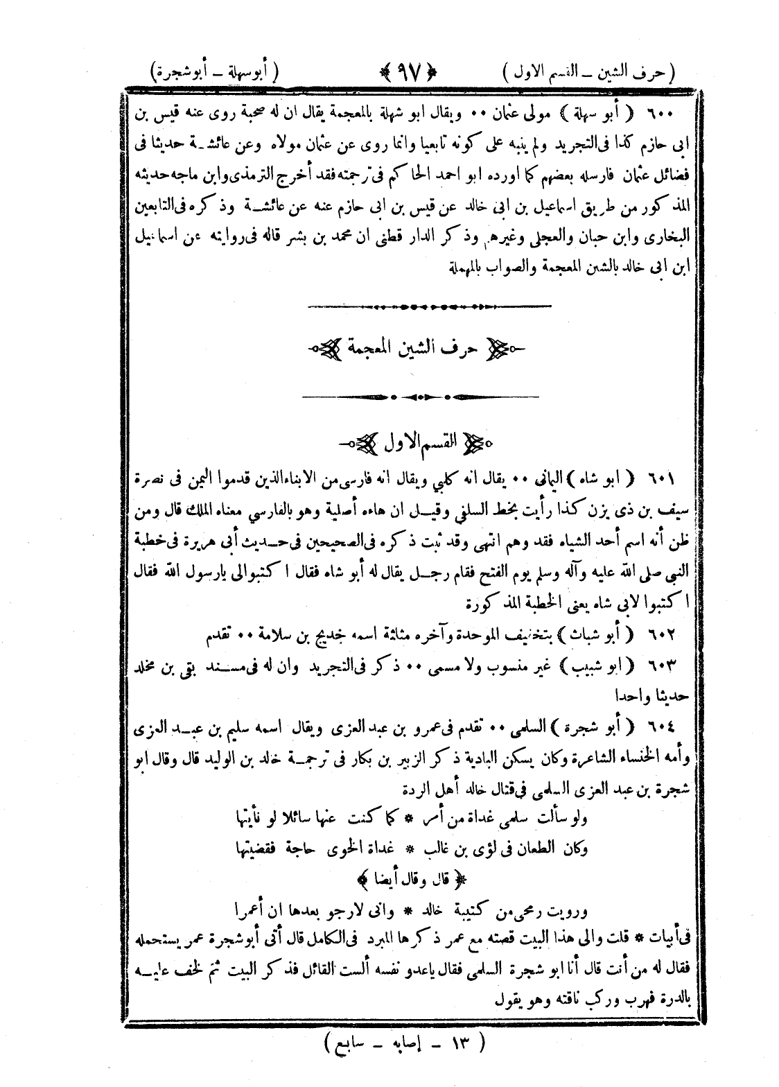 القسم الأول أبو شاه اليماني يقال إنه كلبي ويقال إنه فارسي من الأبناء الذين قدموا اليمن في نصرة سيف بن ذي يزن كذا رأيت بخط السلفي وقيل إن هاءه أصلية وهو بالفارسي معناه الملك قال ومن ظن أنه باسم أحد الشياه فقد وهم انتهى وقد ثبت ذكره في الصحيحين في حديث أبي هريرة في خطبة النبي صلى الله عليه وسلم يوم الفتح فقام رجل يقال له أبو شاه فقال اكتبوا لي يا رسول الله فقال اكتبوا لأبي شاه يعني الخطبة المذكورة أبو شباث بتخفيف الموحدة وآخره مثلثة اسمه خديج بن سلامة تقدم أبو شبيب غير منسوب ولا مسمى ذكر في التجريد وأن له في مسند بقي بن مخلد حديثا واحدا أبو شجرة السلمي تقدم في عمرو بن عبد العزى ويقال اسمه سليم بن عبد العزى وأمه الخنساء الشاعرة وكان يسكن البادية ذكر الزبير بن بكار في ترجمة خالد بن الوليد قال وقال أبو شجرة بن عبد العزى السلمي في قتال خالد أهل الردة ولو سألت سلمى غداة مرامر كما كنت عنها سائلا لو نأيتها وكان الطعان في لؤي بن غالب غداة الجواء حاجة فقضيتها قال وقال أيضا ورويت رمحي من كتيبة خالد وإني لأرجو بعدها أن أعمرا في أبيات قلت وإلى هذا البيت قصته مع عمر ذكرها المبرد في الكامل قال أتى أبو شجرة عمر يستحمله فقال له من أنت قال أنا أبو شجرة السلمي فقال يا عدو نفسه ألست القائل فذكر البيت ثم انحنى عليه بالدرة فهرب وركب ناقته وهو يقول §