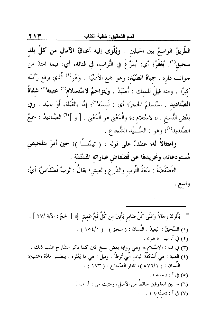 الطريقُ الواسع بين الجبلينِ. ويُلْوى إليه أعناقُ الآمالِ من كلّ بلدٍ سحيقٍ (¬1). يُعَفَّرُ؛ أي: يُمَرَّغُ في التُّرابِ، في فنائه، أي: فيما امتدَّ من جوانب دارِه. جِباهُ الصّيَدِ، وهو جمع الأَصيَد. وَهُو (¬2) الذي يرفع رَأسَه كِبْرًا. ومنه قيلَ للملِك: أَصيَدُ. ويَتزاحمُ لاسْتسلامِ (¬3) عتبته (¬4) شِفاةُ الصناديدِ. استسلمَ الحجرَ، أي: لَمِسَه (¬5)، إمَّا بالقُبْلة، أَوْ باليَد. وفي بَعض النُّسَخ: "لاستلامِ"؛ والْمعنى هو الْمَعنى. [و] (¬6) الصَّناديدُ: حمعُ الصِّنديد (¬7)، وهو: السَّيِّد الشُّجاع.