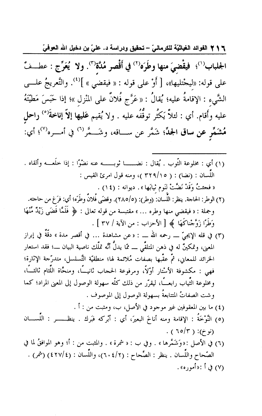الجلباب (¬1)؛ فيقْضِيَ منها وطَرَه (¬2) في أَقْصر مُدَّةٍ (¬3). ولا يُعَرِّج: عطفٌ على قوله: "لِيجْتليها"، [أَوْ على قوله: "فيقضي"] (¬4). والتَّعريجُ على الشَّيءِ: الإقامةُ عليه، يُقالُ: "عَرَّج فُلانٌ على المنْزلِ"، إذا حَبَسَ مَطيّتَهُ عليه وأَقام. أي: لئلَّا يَكثُر توقُّفُه عليه. ولا يُقيم عَليها إلّا إناخة (¬5) راحلٍ مُشَمِّرٍ عن ساق الجدِّ؛ شَمَّر عن ساقه، وشَمَّر (¬6) في أمره (¬7)؛ أي: