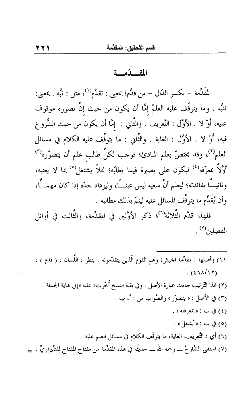 (¬7) استقى الشَّارحُ -رحمه الله- حديثه في هذه المقدِّمة من مفتاح المفتاح للشّيرازي. =