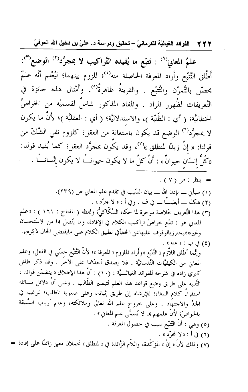 (¬3) هذا التَّعريف خُلاصة موجزة لما حكاه السَّكاكيُّ؛ ولفظه (المفتاح: 161): "علم المعاني هو: تتبّع خواصّ تراكيب الكلام في الإفادة، وما يتّصل بها من الاسْتحسان وغيره؛ ليحترز بالوقوف عليها عن الخطأ في تطبيق الكلام على ما يقتضي الحال ذكره".