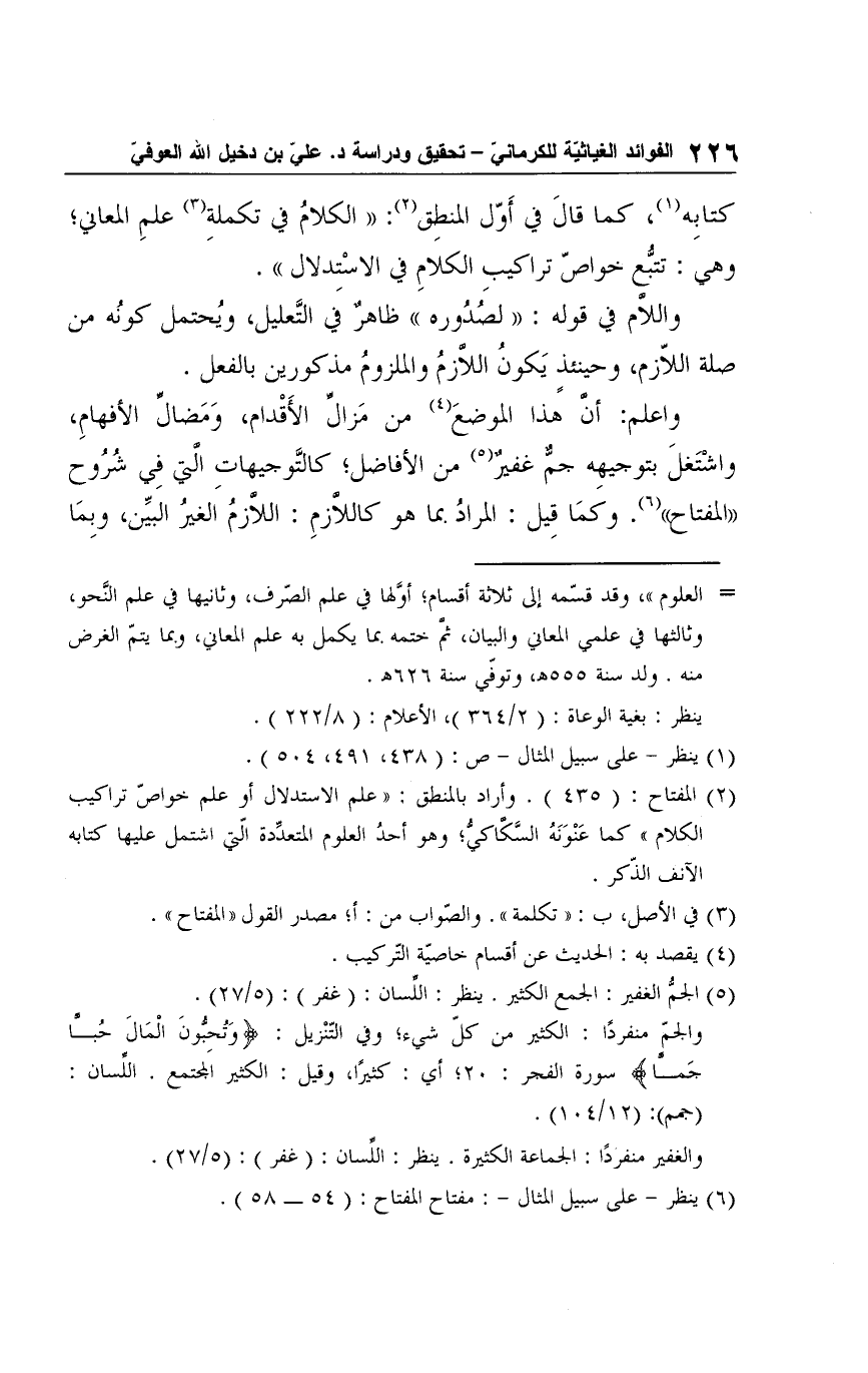 (¬2) المفتاح: (435). وأراد بالمنطق، "علم الاستدلال أو علم خواص تراكيب الكلام، كما عَنْوَنَهُ السَّكاكيُّ؛ وهو أحدُ العلوم المتعدَدة الّتى اشتمل عليها كتابه الآنف الذّكر.