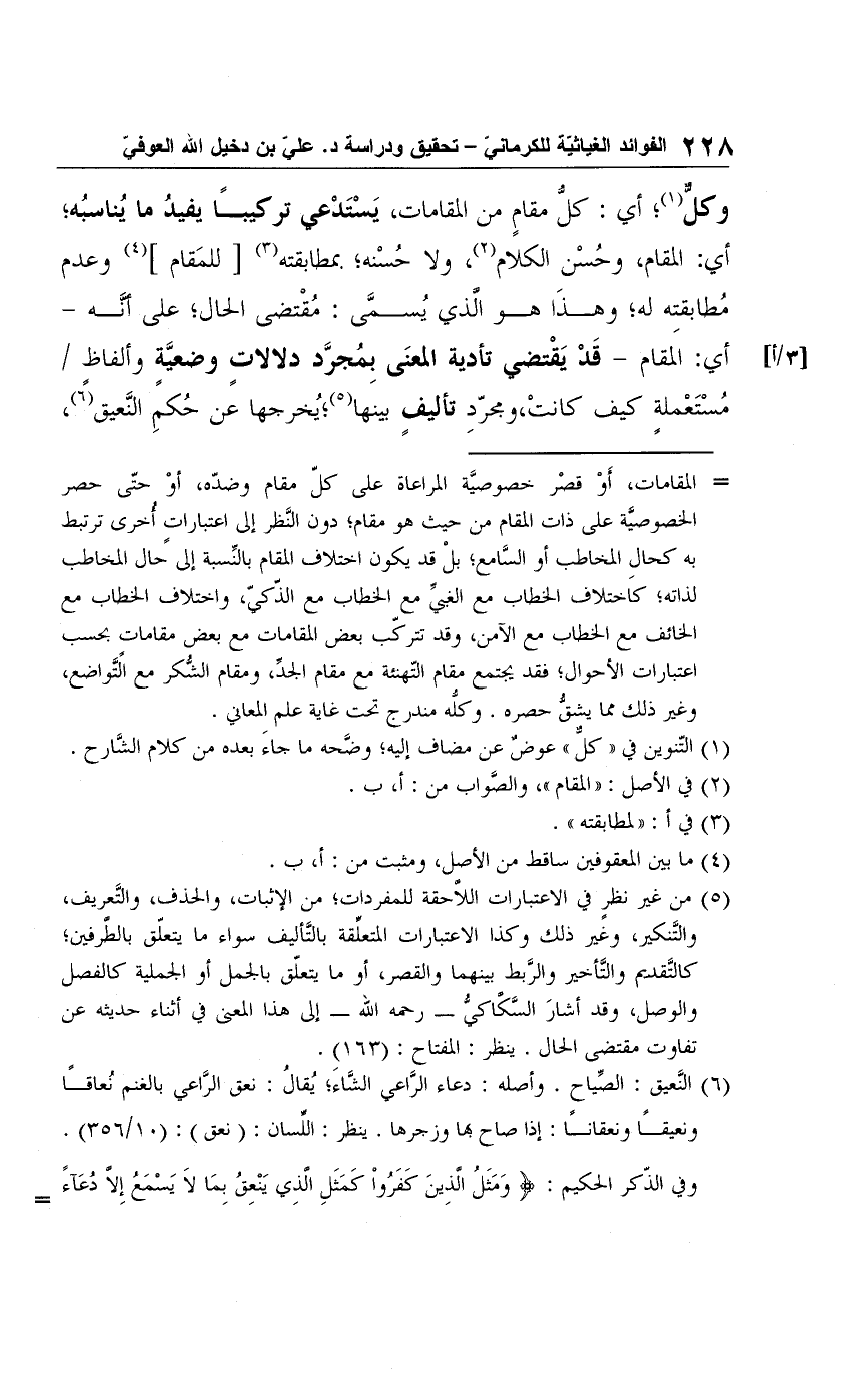 (¬6) النعيق: الصِّياح. وأصله: دعاء الرَّاعي الشَّاءَ؛ يُقالُ: نعق الرَّاعي بالغنم نُعاقًا ونعيقًا ونعقانًا: إذا صاح بها وزجرها. ينظر: اللسان: (نعق): (10/ 356).