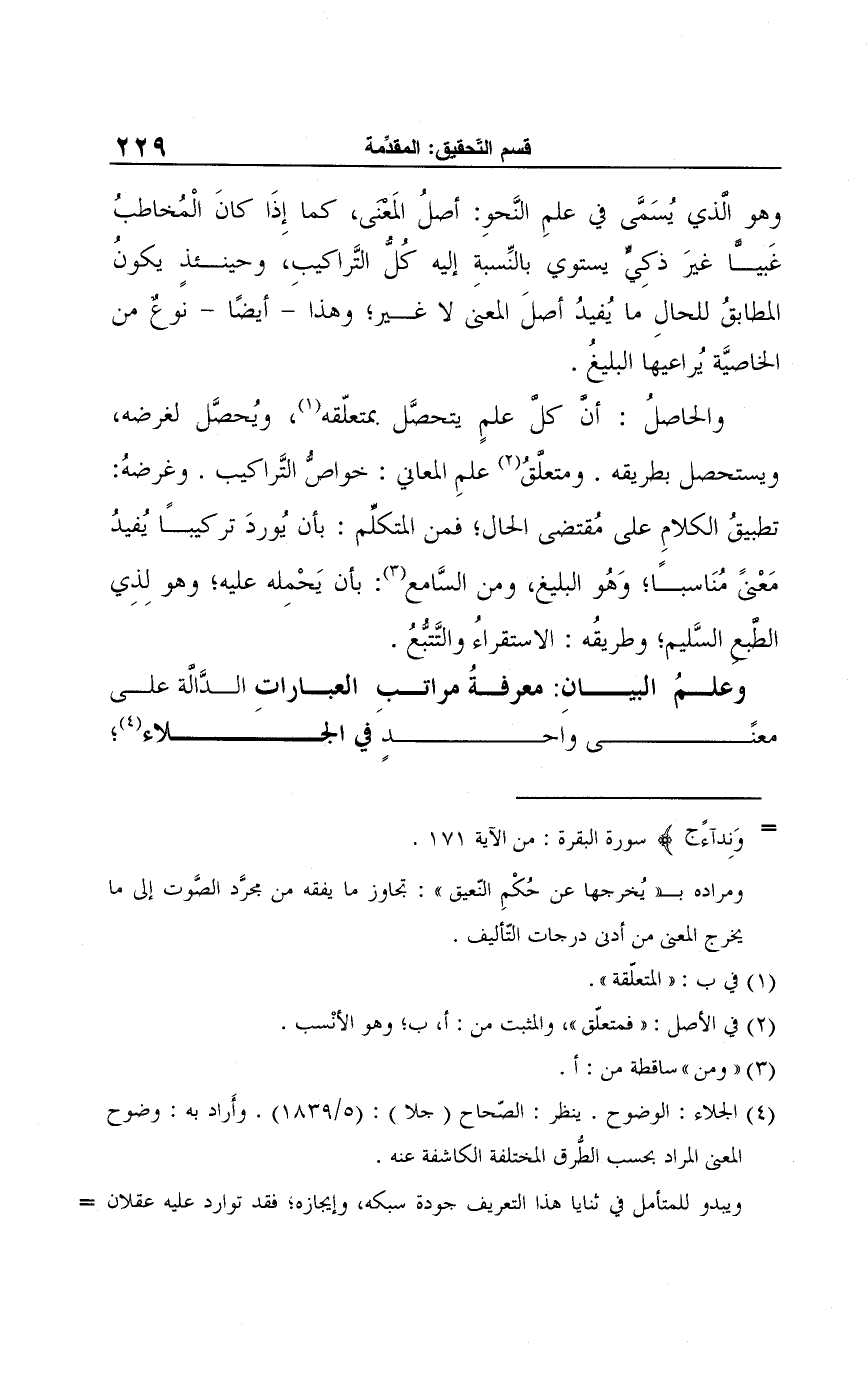 (¬4) الجلاء: الوضوح. ينظر: الصّحاح (جلا): (5/ 1839)، وأَراد به: وضوح المعنى المراد بحسب الطُّرق المختلفة الكاشفة عنه.