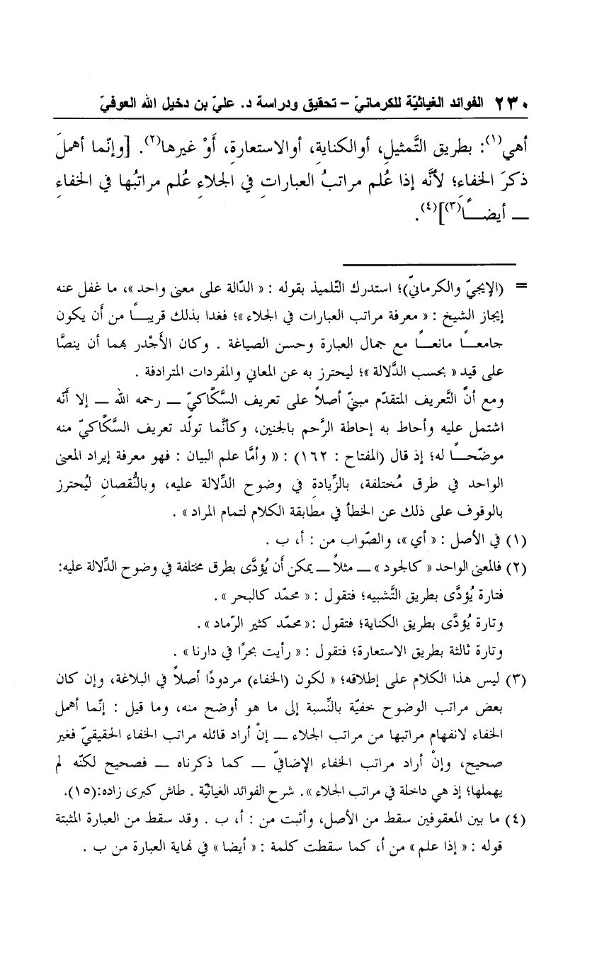 (¬3) ليس هذا الكلام على إطلاقه؛ "لكون (الخفاء) مردودًا أصلًا في البلاغة، وإن كان بعض مراتب الوضوح خفيّة بالنِّسبة إلى ما هو أوضح منه، وما قيل: إنّما أهمل الخفاء لانفهام مراتبها من مراتب الجلاء -إنْ أراد قائله مراتب الخفاء الحقيقيّ فغير صحيح، وإن أراد مراتب الخفاء الإضافيّ -كما ذكرناه- فصحيح لكنّه لم يهملها؛ إذ هي داخلة في مراتب الجلاء". شرح الفوائد الغياثية. طاش كبرى زاده: (15).