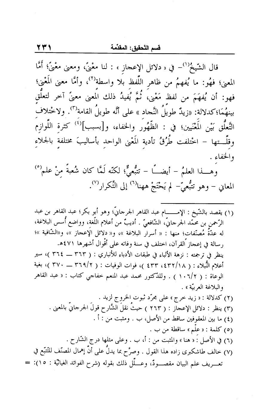 (¬1) يقصد بالشّيخ: الإمام عبد القاهر الجرجانيّ؛ وهو أبو بكر؛ عبد القاهر بن عبد الرّحمن بن محمّد الجرجانيّ، الشافعيّ. أديبٌ من أعلام اللّغة، وواضع أسس البلاغة، له عدّةُ مُصنّفات؛ منها: "أسرار البلاغة"، و"دلائل الإعجاز"، و"الشافية"؛ رسالة في إعجاز القرآن، اختلف في سنة وفاته على أقْوال أشهرها 471 هـ.