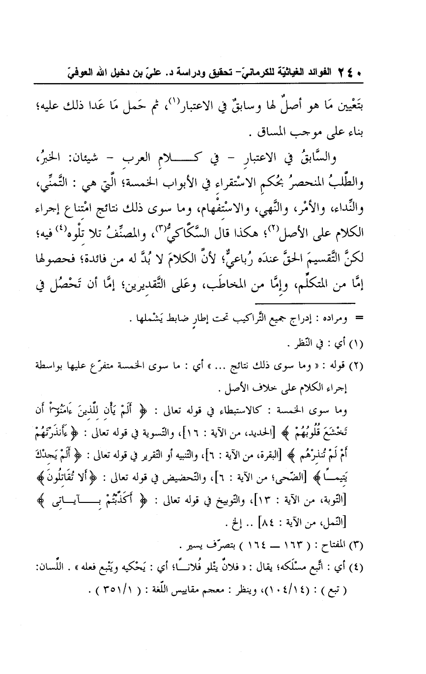 والسَّابقُ في الاعتبارِ -في كلامِ العربِ- شيئان: الخبرُ، والطلبُ المنحصرُ بحُكمِ الاستقراءِ في الأبواب الخمسة؛ الّتي هي: التَّمنِّي، والنِّداء، والأمْر، والنَّهي، والاسْتِفْهام، وما سوى ذلك نتائج امتِناع إجراء الكلام على الأصل (¬2)؛ هكذا قال السَّكاكيُّ (¬3)، والمصنِّفُ تلا تِلْوه (¬4) فيه؛ لكنَّ التَّقسيمَ الحقَّ عندَه رُباعيٌّ؛ لأن الكلامَ لا بُدَّ له من فائدة؛ فحصولها إمَّا من المتكلم، وإِمَّا من المخاطَب، وعَلى التَّقدِيرين؛ إمَّا أن تَحصُل في