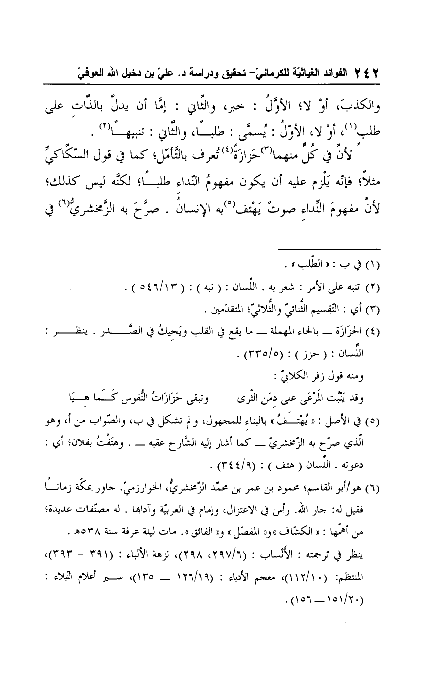 (¬6) هو أبو القاسم؛ محمود بن عمر بن محمّد الزمخشريُّ، الخوارزميّ. جاور بمكّة زمانًا فقيل له: جار الله. رأس في الاعتزال، وإمام في العربيّة وآدابها. له مصنفات عديدة؛ من أهمّها: "الكشّاف" و"المفصّل" و"الفائق". مات ليلة عرفة سنة 538 هـ.