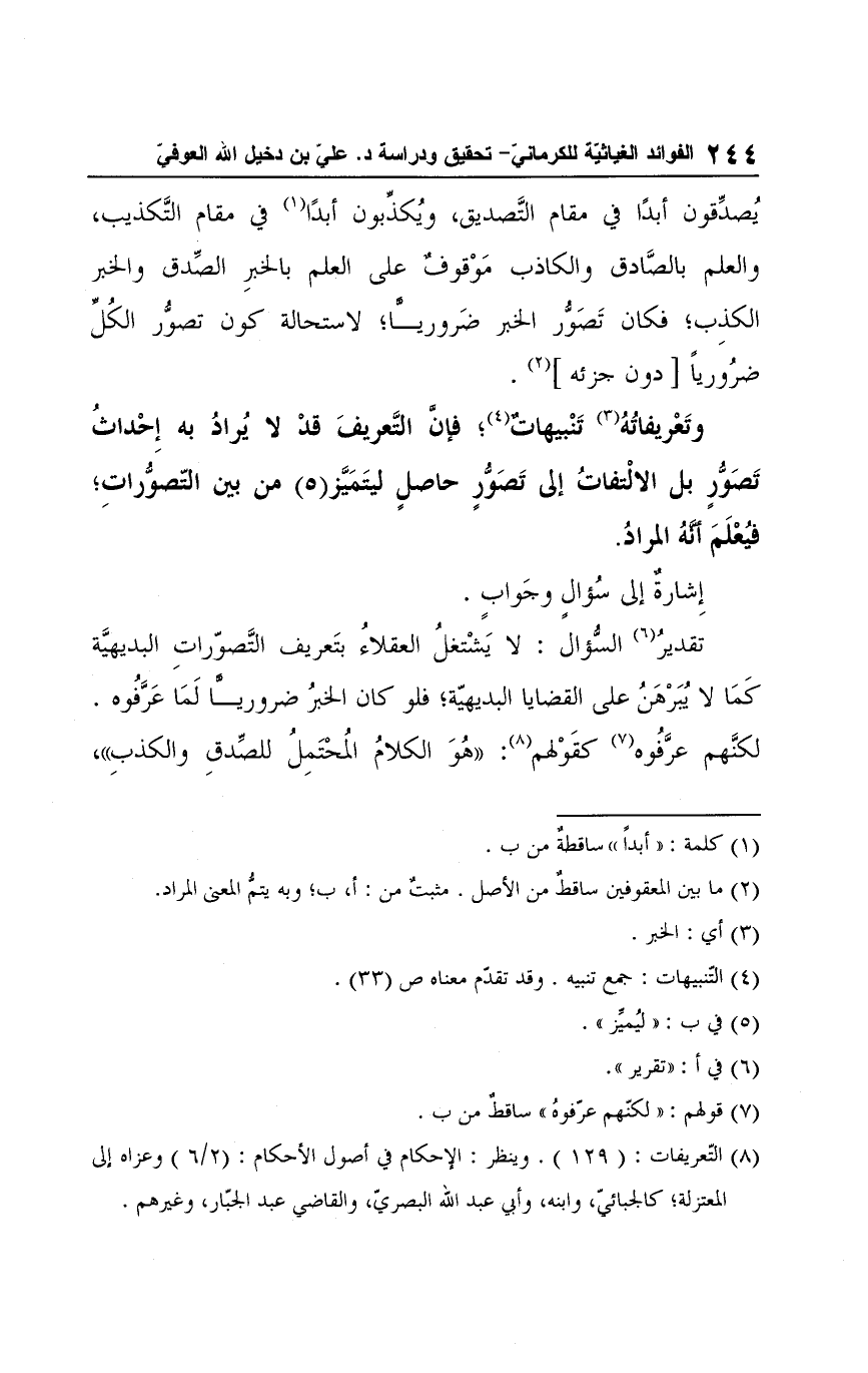 (¬8) التّعريفات: (129). وينظر: الإحكام في أصول الأحكام: (2/ 6) وعزاه إلى المعتزلة؛ كالجبائيّ، وابنه، وأبي عبد الله البصريّ، والقاضي عبد الجبّار، وغيرهم.