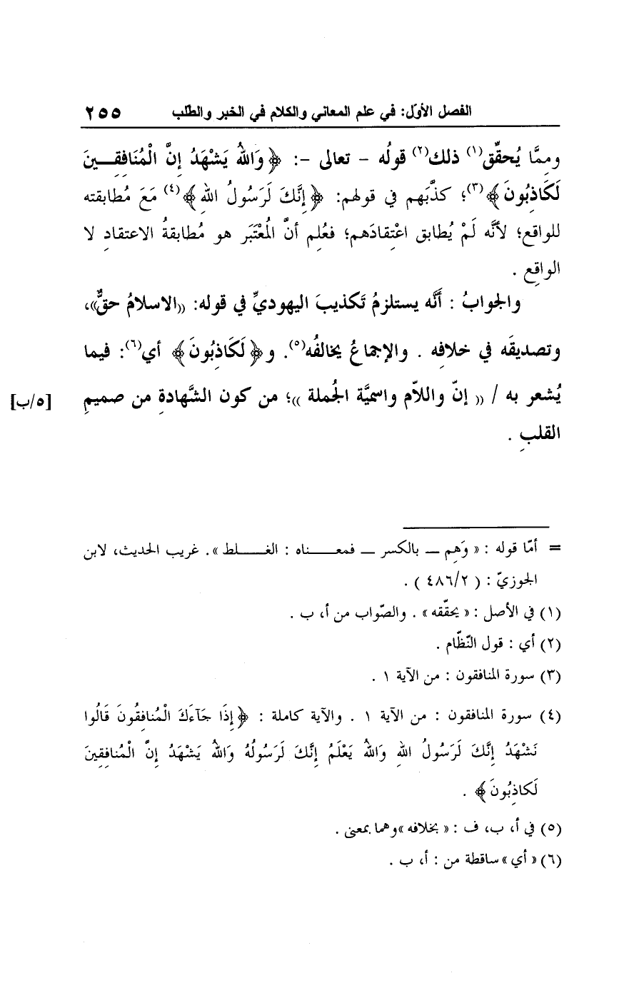 والجوابُ: أَنَّه يستلزمُ تَكذيبَ اليهوديِّ في قوله: "الإسلامُ حقٌّ"، وتصديقَه في خلافِه. والإجماعُ يخالفُه (¬5). و {لَكَاذِبُونَ} أي (¬6): فيما يُشعر به "إنّ واللّام واسميَّة الجُملة"؛ من كون الشَّهادةِ من صميمِ القلبِ.
