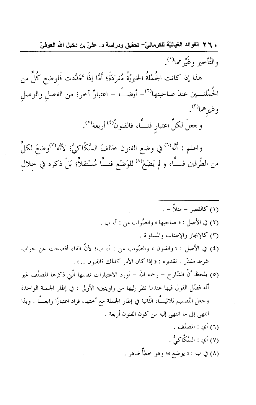 (¬5) يلحظ أنَّ الشّارح -رحمه الله- أورد الاعتبارات نفسها الّتي ذكرها المصنِّف غير أنّه فضّل القول فيها عندما نظر إليها من زاويتين؛ الأولى: في إطار الجملة الواحدة وجعل التَّقسيم ثلاثيًّا، الثّانية في إطار الجملة مع أختها، فزاد اعتبارًا رابعًا. وبذا انتهى إلى ما انتهى إليه من كون الفنون أربعة.