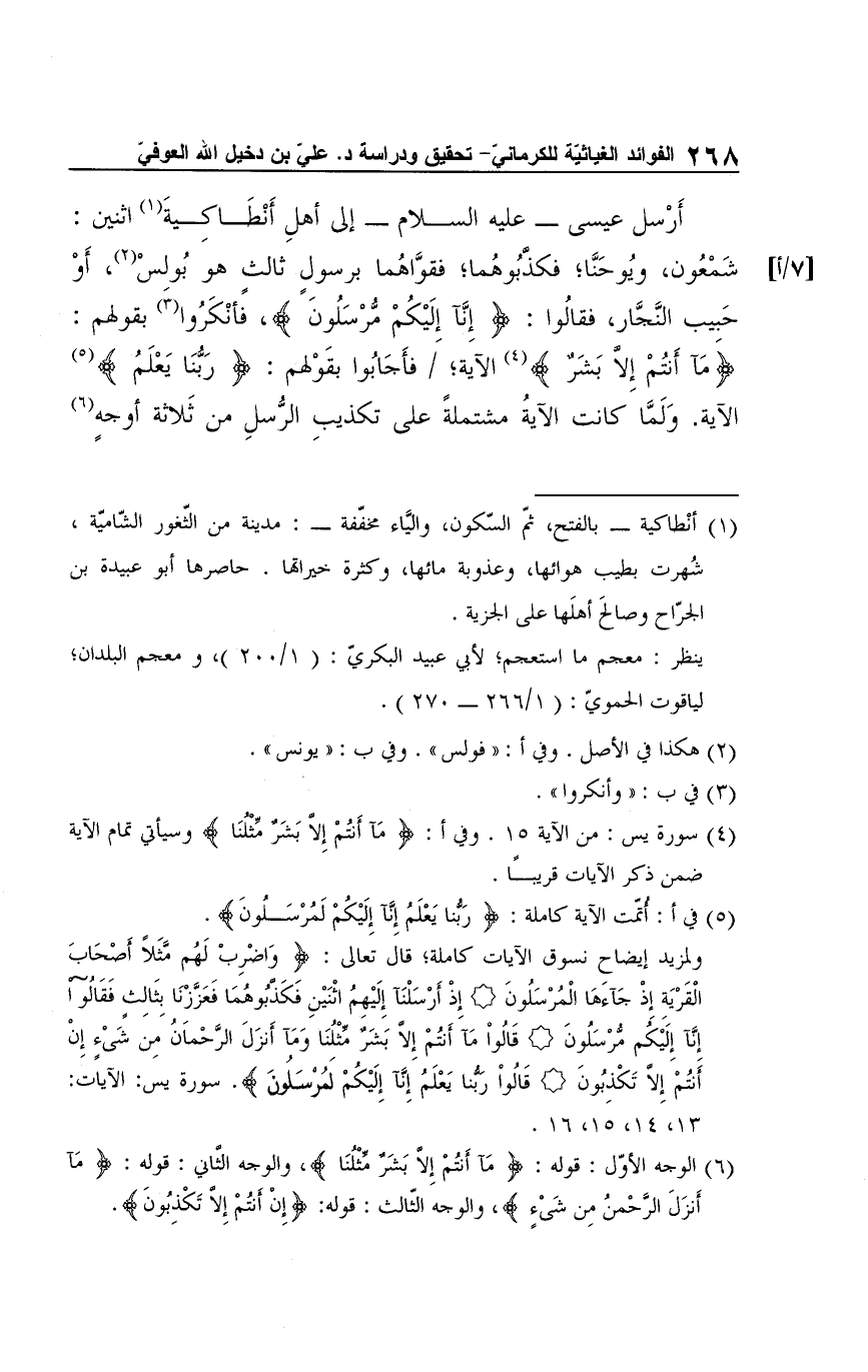 أَرْسل عيسى - عليه السلام - إلى أهلِ أَنْطَاكِيةَ (¬1) اثنين: شَمْعُون، ويُوحَنَّا؛ فكذَّبُوهُما؛ فقوَّاهُما برسول ثالثٍ هو بُولِسْ (¬2)، أَوْ حَبيب النَّجَّار، فقالُوا: {إِنَّا إِلَيْكُمْ مرْسَلُونَ}، فأنْكَرُوا (¬3) بقولهم: {مَا أَنتُمْ إلا بَشَرٌ} (¬4) الآية؛ فأَجَابُوا بقَوْلهم: {رَبُّنَا يَعْلَمُ} (¬5) الآية. وَلَمَّا كانت الآيةُ مشتملةً على تكذيبِ الرُّسلِ من ثَلاثة أوجهٍ (¬6)