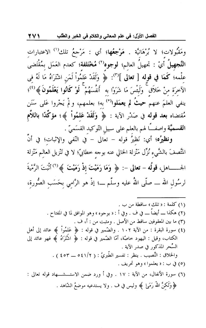 (¬6) سورة الأنفال، من الآية: 17. وفي أورد ضمن الاستشهاد قوله تعالى: {وَلَكِنَّ الله رَمَى} وليس في ف. ولا يستدعيه موضعُ الشّاهد.
