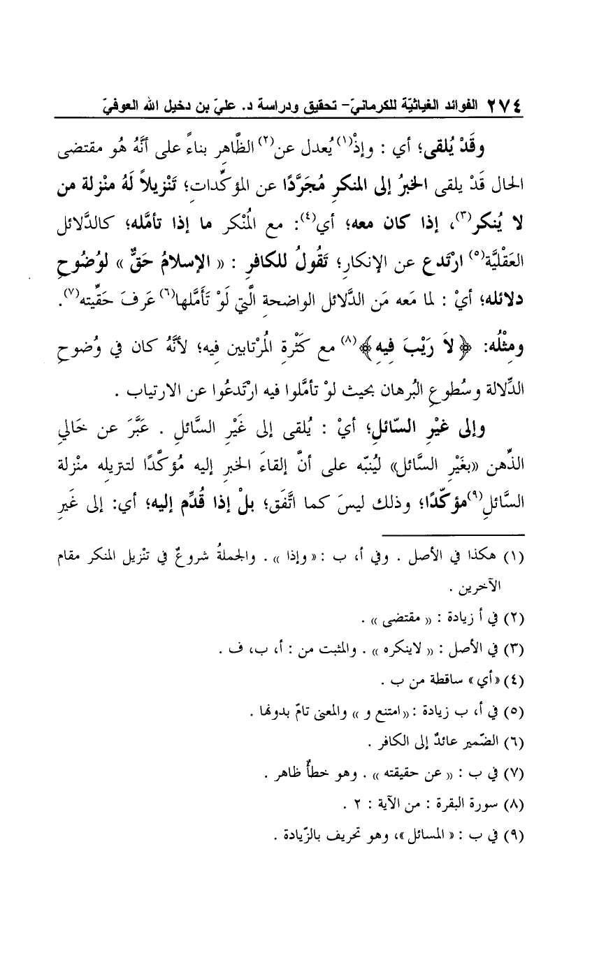 وإلى غيْرِ السّائلِ؛ أي: يُلقى إلى غَيْرِ السَّائلِ. عَبَّرَ عن خَالي الذِّهن "بغَيْرِ السَّائل" ليُنبّه على أنَّ إلقاءَ الخبرِ إليه مُؤكَّدًا لتنزيلِه منْزلة السَّائلِ (¬9) مؤكّدًا؛ وذلك ليسَ كما اتَّفَق؛ بلْ إذا قُدِّم إليه؛ أي: إلى غَيرِ