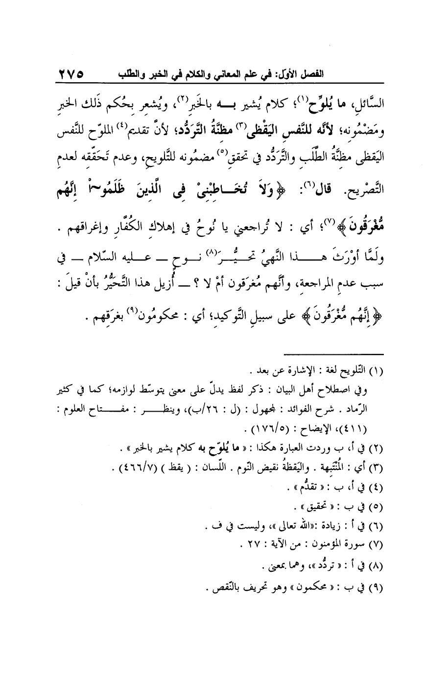 السَّائلِ، ما يُلوِّح (¬1)، كلام يُشير به بالخَبرِ (¬2)، ويُشعِر بِحُكم ذَلك الخبرِ ومَضْمُونِه؛ لأنَّه للنَّفسِ اليَقْظي (¬3) مظِنَّةُ الترَدُّد؛ لأنَّ تقديم (¬4) الملوّح للنَّفس اليَقظي مظِنَّةُ الطَّلبِ والتَّرَدُّد في تحققِ (¬5) مضمُونه للتَّلويحِ، وعدم تَحَقّقِه لعدمِ التَّصْريح. قال (¬6): {وَلَا تُخَاطِبْنِي فِي الَّذِينَ ظَلَمُوا إِنَّهُمْ مُغْرَقُونَ} (¬7)، أي: لا تُراجعني يا نُوحُ في إهلاكِ الكُفَّارِ وإغراقهم.