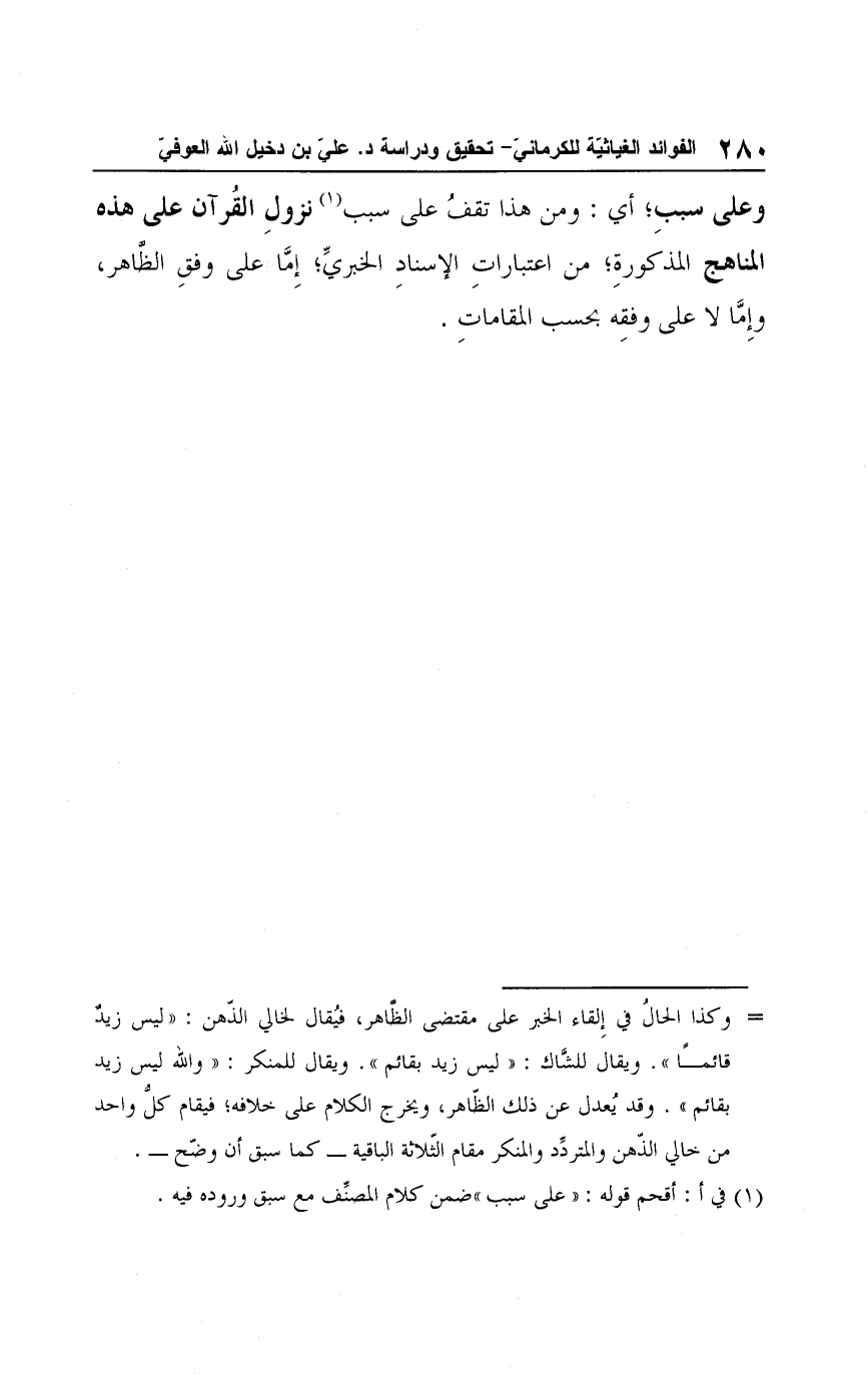 وعلى سببِ؛ أي: ومن هذا تقفُ على سبب (¬1) نزولِ القُرآن على هذه المناهج المذكورةِ؛ من اعتباراتِ الإسنادِ الخبريِّ، إِمَّا على وفقِ الظّاهر، وإِمَّا لا على وفقِه بحسب المقاماتِ.