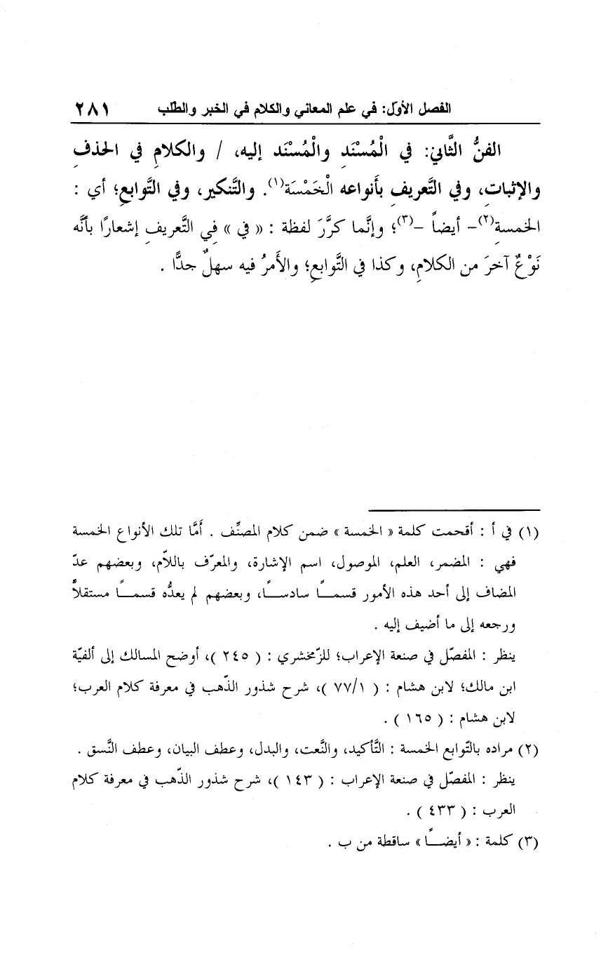 الفنُّ الثَّاني: في الْمُسْنَدِ والْمُسْنَد إليه، والكلامِ في الحذفِ والإثبات، وفي التَّعريفِ بأَنواعه الْخَمْسَة (¬1). والتَّنكر، وفي التَّوابعِ؛ أي: الخمسةِ (¬2) -أيضًا- (¬3)؛ وإنَّما كرَّرَ لفظة: "في" فِي التَّعريفِ إشعارًا بأنَّه نَوْعٌ آخرَ من الكلامِ، وكذا في التَّوابع؛ والأَمرُ فيه سهلٌ جدًّا.
