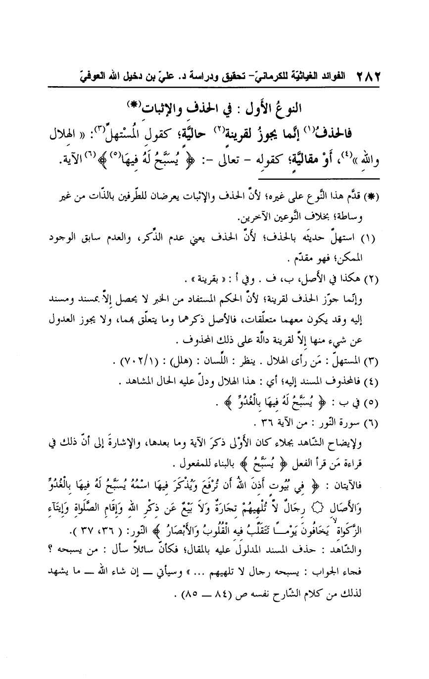 والشّاهد: حذف المسند المدلول عليه بالمقال؛ فكأن سائلًا سأل: من يسبحه؟ فجاء الجواب: يسبحه رجال لا تلهيهم ... " وسيأتي -إن شاء الله- ما يشهد لذلك من كلام الشّارح نفسه ص (84 - 85).