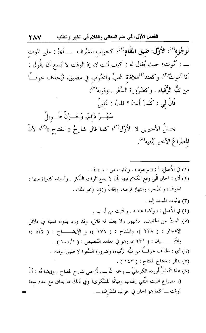 (¬8) هذا التَّعليلُ أَورده الكرمانيّ -رحمه الله- ردًّا على شارح المفتاح. وإيضاحُه: أنّ في مصراع البيت الثَّاني إطناب ومباثّة للشَّكوى؛ وفي ذلك ما يتنافى مع عدم سِعة الوقت -كما هو الحال في جواب المشْرِف-. =
