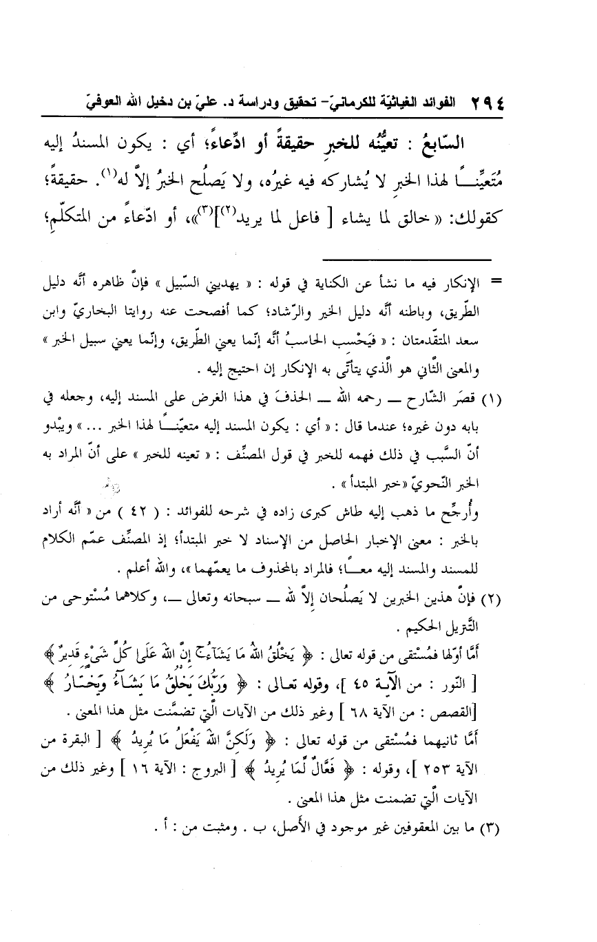 وأُرجِّح ما ذهب إليه طاش كبرى زاده في شرحه للفوائد: (42) من "أنَّه أراد بالخبر: معني الإخبار الحاصل من الإسناد لا خبر المبتدأ؛ إذ المصنِّف عمّم الكلام للمسند والمسند إليه معًا؛ فالمراد بالمحذوف ما يعمّهما"، والله أعلم.