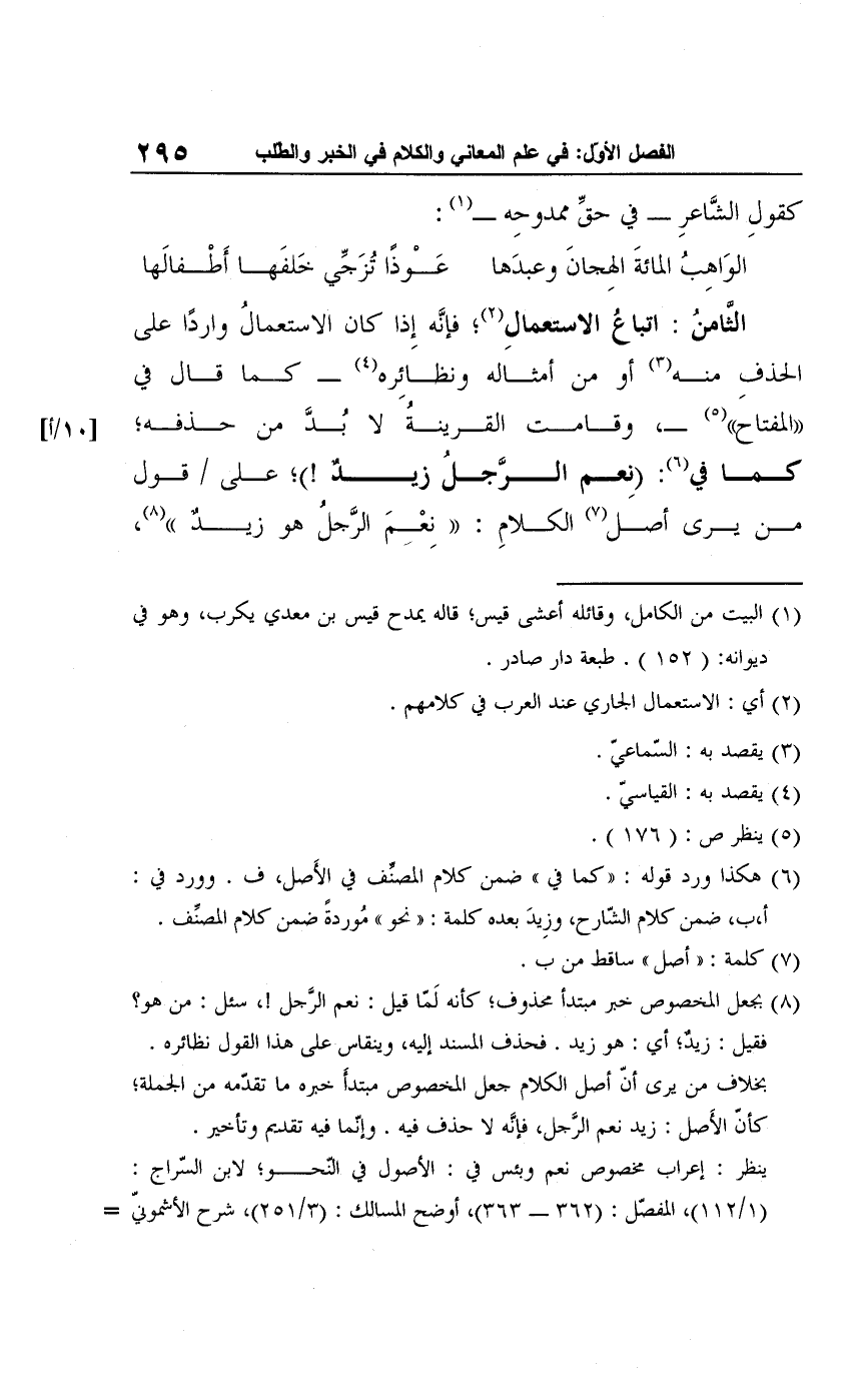 الثَّامنُ: اتباعُ الاستعمالِ (¬2)؛ فإنَّه إِذا كان الاستعمالُ واردًا على الحذفِ منه (¬3) أو من أمثاله ونظائِره (¬4) -كما قال في "المفتاح" (¬5) -، وقامت القرينةُ لا بُدَّ من حذفه؛ كما في (¬6): (نِعم الرَّجلُ زيدٌ!)، على قول من يرى أصل (¬7) الكلامِ: "نِعمَ الرَّجلُ هو زيدٌ" (¬8)،