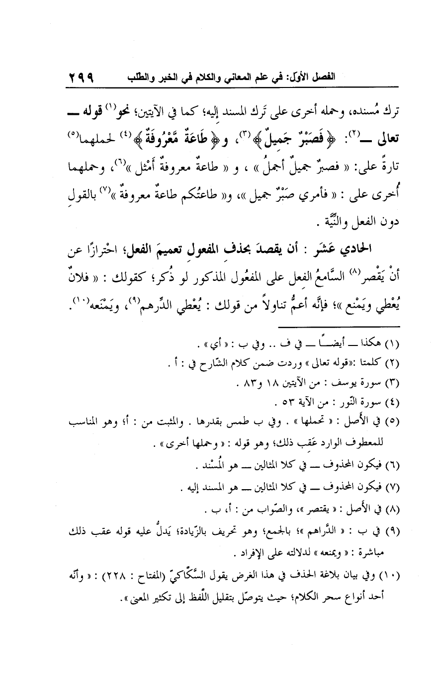 ترك مُسنده، وحمله أخرى على تَرك المسند إِليه؛ كما في الآيتين؛ نحو (¬1) قوله -تعالى- (¬2): {فَصَبْرٌ جَمِيلٌ} (¬3)، و {طَاعَةٌ مَّعْرُوفَةٌ} (¬4) لحملهما (¬5) تارةً على: "فصبرٌ جميلٌ أجملُ"، و "طاعةٌ معروفةٌ أَمْثل" (¬6)، وحملهما أُخرى على: "فأمري صَبْرٌ جميل"، و"طاعتُكم طاعةٌ معروفةٌ" (¬7) بالقولِ دون الفعل والنِّيَّة.