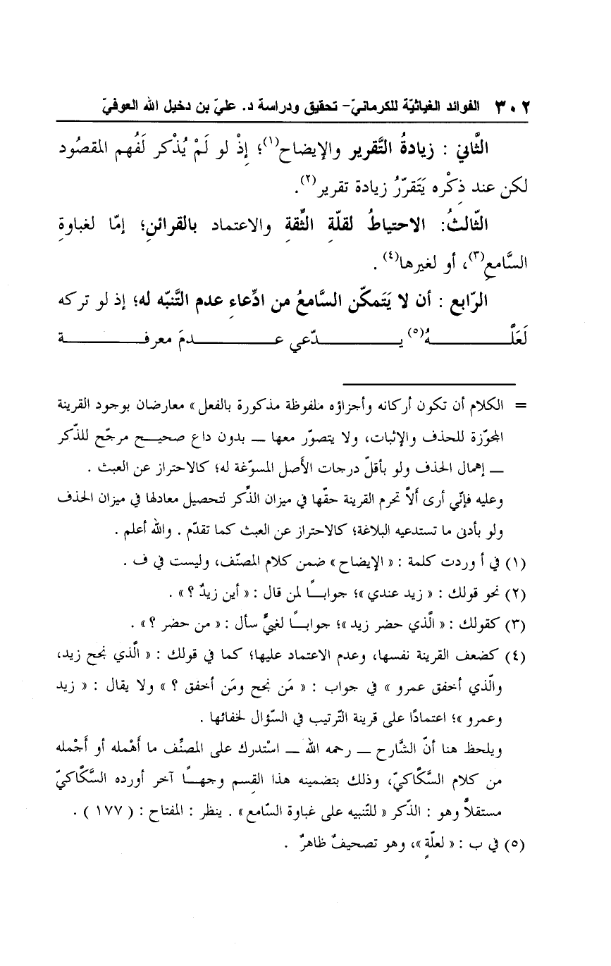 ويلحظ هنا أنّ الشَّارح -رحمه الله- اسْتدرك على المصنِّف ما أَهْمله أو أَجْمله من كلام السَّكاكيّ، وذلك بتضمينه هذا القِسم وجهًا آخر أورده السَّكاكيّ مستقلا وهو: الذّكر "للتّنبيه على غباوة السّامع". ينظر: الفتاح: (177).