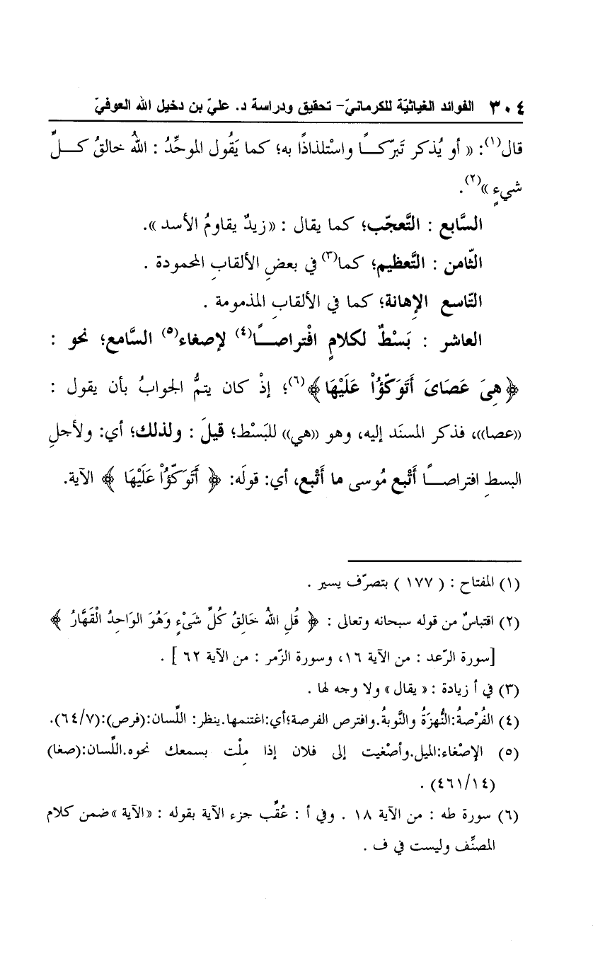 العاشر: بَسْطٌ لكلامٍ افْتراصًا (¬4) لإصغاء (¬5) السامع؛ نحو: {هِيَ عَصَايَ أَتَوَكَّأُ عَلَيْهَا} (¬6)؛ إذْ كان يتمُّ الجوابُ بأن يقول: "عصا"، فذكر المسنَد إليه، وهو "هي" للبَسْط؛ قيلَ: ولذلك، أي: ولأجلِ البسطِ افتراصًا أَتْبع مُوسى ما أَتْبع, أي: قولَه: {أَتَوَكَّأُ عَلَيْهَا} الآية.