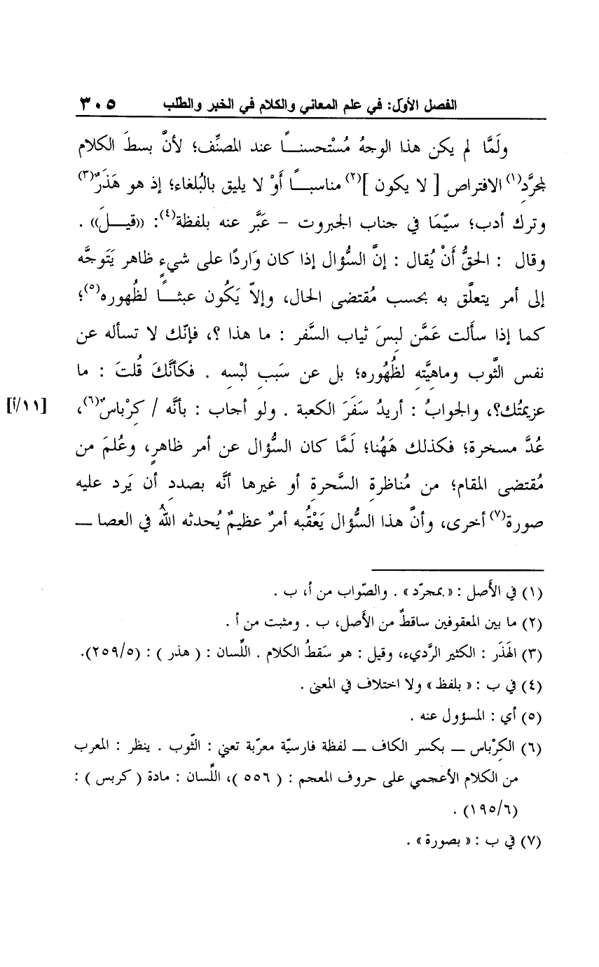 ولَمَّا لم يكن هذا الوجهُ مُسْتحسنًا عند المصنِّف؛ لأنَّ بسطَ الكلام لمجرَّدِ (¬1) الافتراص [لا يكون] (¬2) مناسبًا أَوْ لا يليق بالبُلغاء، إذ هو هَذَرٌ (¬3) وترك أدب؛ سيّمَا في جناب الجبروت -عَبَّر عنه بلفظة (¬4): "قيلَ". وقال: الحقُّ أَنْ يُقال: إن السُّؤال إذا كان وَاردًا على شيءٍ ظاهر يَتَوجَّه إلى أمر يتعلق به بحسب مُقتضى الحال، وإلّا يَكُون عبثَا لظُهوره (¬5)؛ كما إذا سأَلت عَمَّن لبِسَ ثياب السَّفر: ما هذا؟، فإنّك لا تسأله عن نفس الثوب وماهِيَّتهِ لظهُوره؛ بل عن سَببِ لبْسِه. فكأنكَ قُلتَ: ما عزيمتُك؟، والجوابُ: أريدُ سَفَرَ الكعبة. ولو أجاب: بأنَه كِرْباس (¬6)، عُدَّ مسخرة؛ فكذلك هَا هُنا، لَمَّا كان السُّؤال عن أمر ظاهرٍ، وعُلمَ من مُقتضى المقام؛ من مُناظرةِ السَّحرةِ أو غيرها أنَّه بصددِ أن يَرد عليه صورة (¬7) أخرى، وأن هذا السُّؤال يَعْقُبه أمرٌ عظيمٌ يُحدثه الله في العصا -