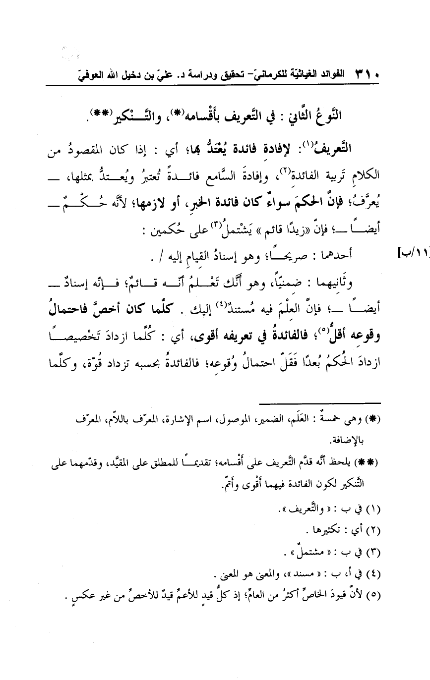 (**) يلحظ أنَّه قدَّم التَّعريف على أَقْسامه؛ تقديمًا للمطلق على المقيَّد، وقدّمهما على التَّنكير لكون الفائدة فيهما أَقْوى وأَتمّ.