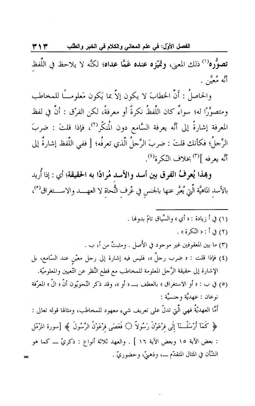(¬4) فإذا قلت: "ضرب رجلٌ"؛ فليس فيه إشارة إلى رجل معيّنٍ عند السّامع، بل الإشارة إلى حقيقة الرَّجل المعلومة للمخاطب مع قطع النَّظر عن التّعيين والمعلومية.