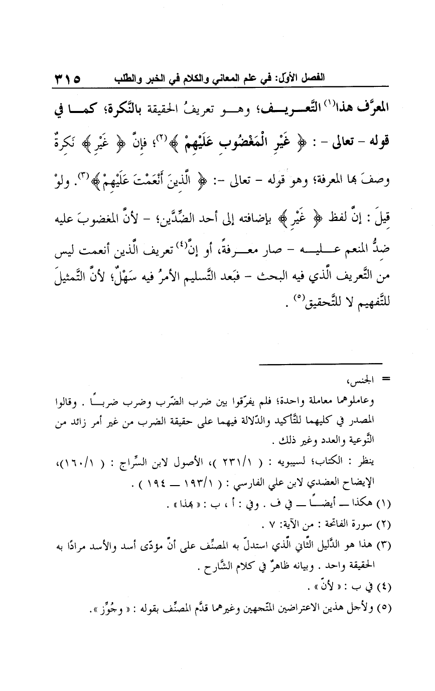 المعرَّف هذا (¬1) التَّعريف؛ وهو تعريفُ الحقيقة بالنَّكرة؛ كما في قوله -تعالى-: {غَيْرِ الْمَغْضُوبِ عَلَيْهِمْ} (¬2)؛ فإِن {غَيْرِ} نَكِرةٌ وصفَ بها المعرفة؛ وهو قوله -تعالى-: {صِرَاطَ الَّذِينَ أَنْعَمْتَ عَلَيْهِمْ} (¬3). ولوْ قِيلَ: إن لفظ {غَيْرِ} بإضافته إلى أحد الضِّدَّين؛ -لأن المغضوبَ عليه ضِدُّ المنعم عليه- صار معرفةً، أو إن (¬4) تعريف الّذين أنعمت ليس من التَّعريف الذي فيه البحث- فبَعد التَّسليم الأمرُ فيه سَهْلٌ؛ لأن التَّمثيلَ للتَّفهيم لا للتَّحقيق (¬5).