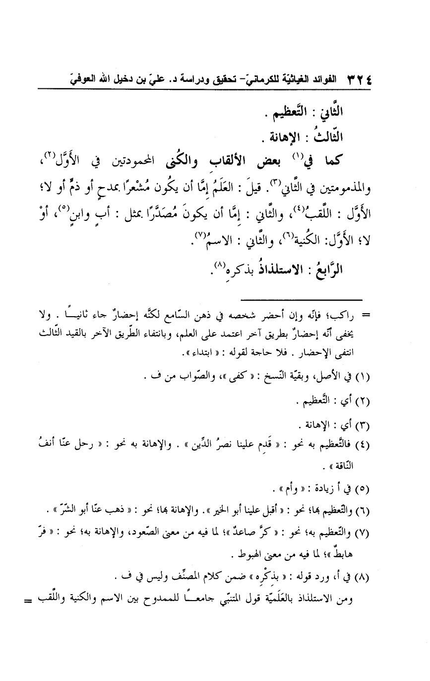 (¬4) فالتَّعظيم به نحو: "قَدِم علينا نصرُ الدِّين". والإهانة به نحو: "رحل عنّا أنف الناقة".