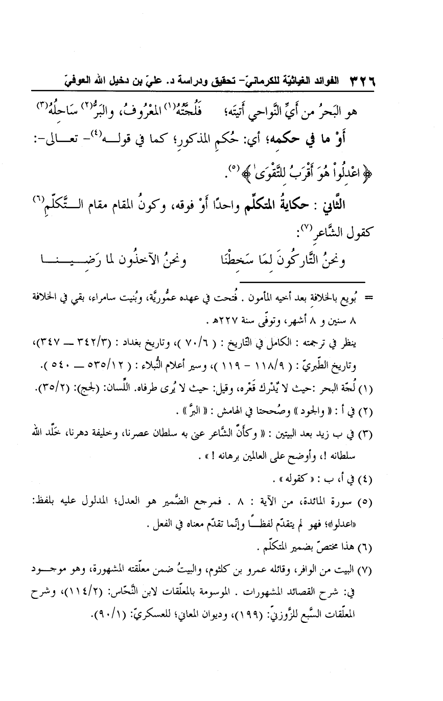 (¬7) البيت من الوافر، وقائله عمرو بن كلثوم، والبيتُ ضمن معلّقته المشهورة، وهو موجود في: شرح القصائد المشهورات. الموسومة بالمعلقات لابن النَّحّاس: (2/ 114)، وشرح المعلّقات السَّبع للزَّوزنيّ: (199)، وديوان المعاني؛ للعسكريّ: (1/ 90).