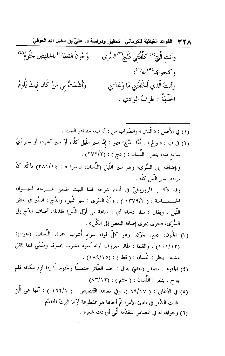 وقد ذكر المروزوقي في أثناء شرحه لهذا البيت ضمن شرحه لديوان الحماسة: (3/ 1379): "أن السّرى: سير اللَّيل، والدلج: السَّير في بعض اللّيل. ويقال: سار دلجة؛ أي: ساعة من أوّل الليل؛ فلذلك أضاف الدّلج إلى السُّرَى، فجرى مجرى إضافة البعض إلى الكُلّ".