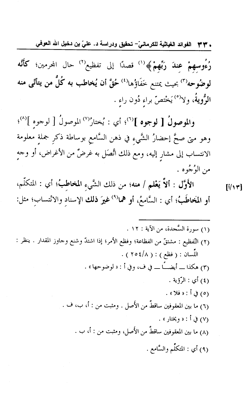 رُءُوسِهِمْ عِنْدَ رَبِّهِمْ} (¬1) قصدًا إلى تفظيع (¬2) حال المجرمين، كأنه لوضُوحه (¬3) بحيث يمتنع خَفَاؤُها (¬4) حُقَّ أن يُخاطب به كُلُّ من يتأتى منه الرُّويةُ، ولا (¬5) يَخْتصّ براءٍ دُون راءٍ.