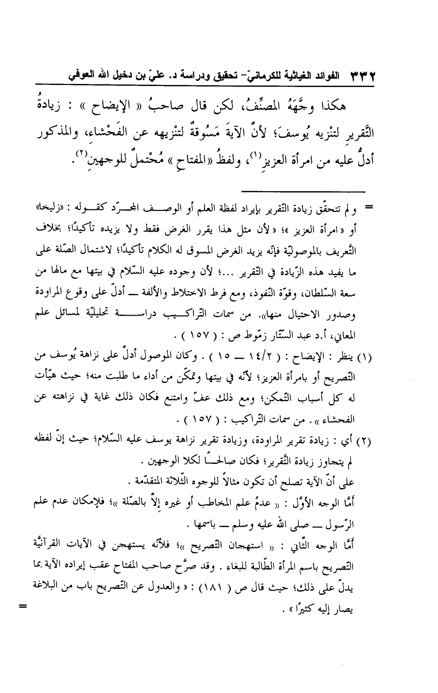 (¬1) ينظر: الإيضاح: (2/ 14 - 15). وكان الموصول أدل على نزاهة يُوسف من التّصريح أو بامرأة العزيز؛ لأنه في بيتها وتمكّن من أداء ما طلبت منه؛ حيث هيّأت له كل أسباب التّمكن؛ ومع ذلك عفّ وامتنع فكان ذلك غاية في نزاهته عن الفحشاء". من سمات التّراكيب: (157).