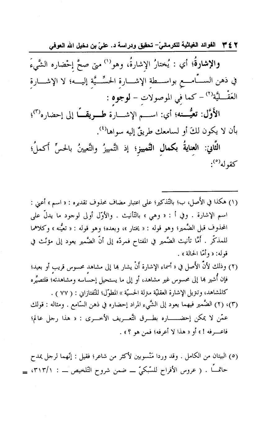 (¬1) هكذا في الأَصل، ب؛ بالتَّذكير؛ على اعتبار مضاف محذوف تقديره: "اسم" أعني: اسم الإشارة. وفي أ: "وهي" بالتّأنيث. والأول أولى لوجود ما يدل على المحذوف قبل الضَّمير؛ وهو قوله: "يختار"، وبعده؛ وهو قوله: "تعينه" وكلاهما للمذكّر. أما تأنيث الضمير في المفتاح فمردّه إلى أنّ الضَّمير يعود إلى مؤنّث في قوله: "وأما الحالة".