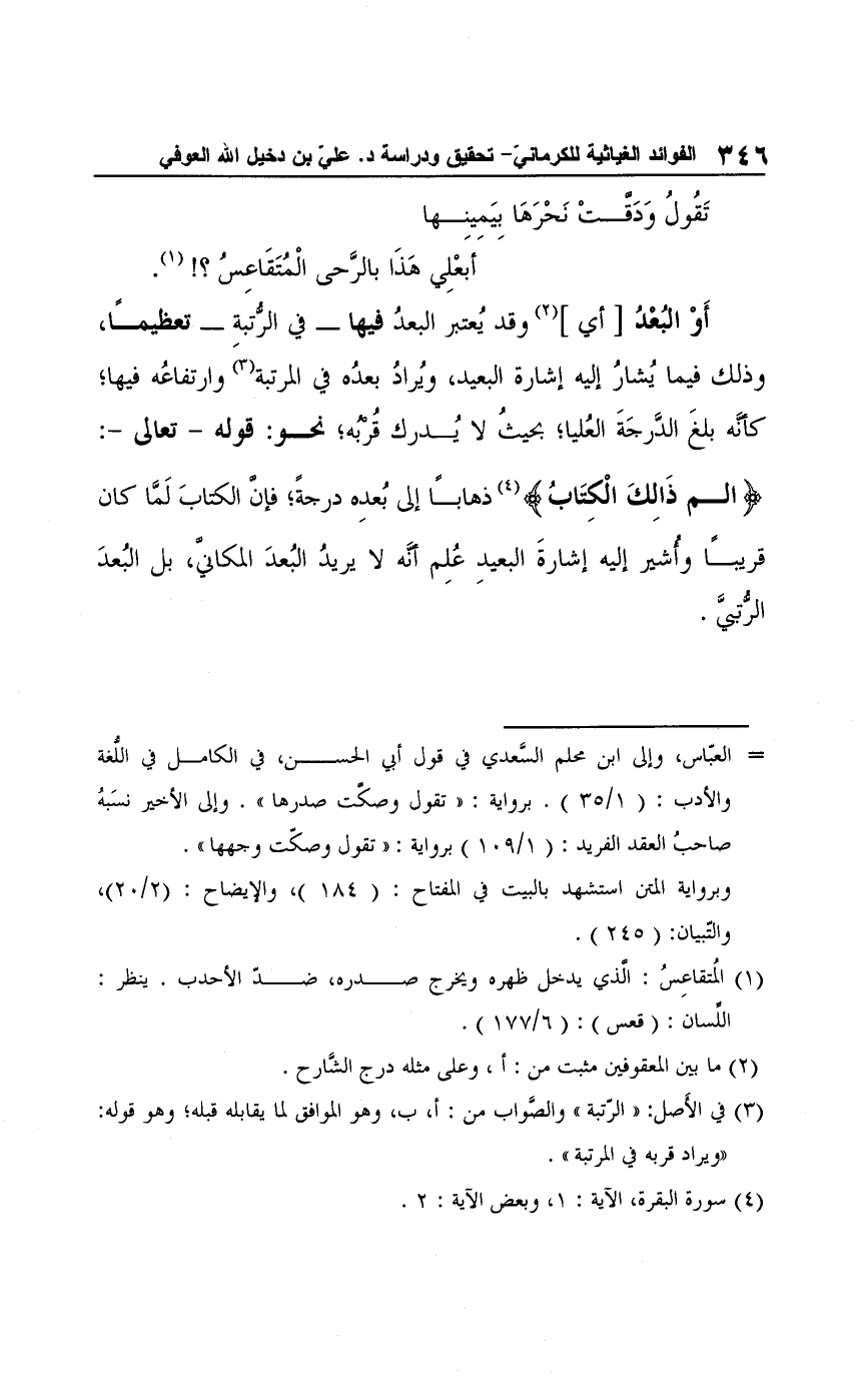 {الم (1) ذَلِكَ الْكِتَابُ} (¬4) ذهابًا إلى بُعدِه درجةً، فإن الكتابَ لَمَّا كان قريبًا وأُشير إليه إشارةَ البعيدِ عُلِم أنَّه لا يريدُ البُعدَ المكاني، بل البُعدَ الرُّتبيَّ.