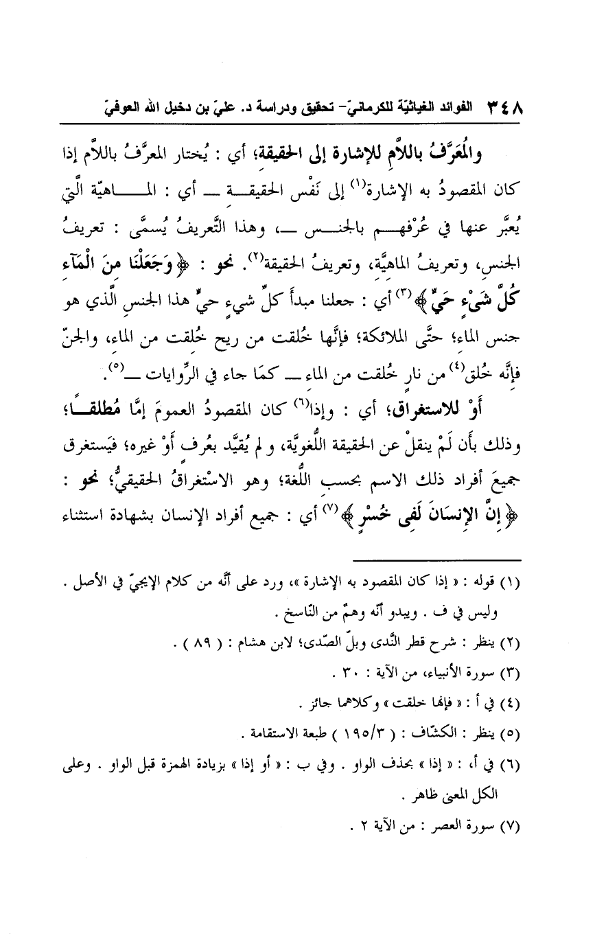 والمُعَرَّفُ باللامِ للإشارة إلى الحقيقةِ؛ أي: يُختار المعرَّفُ باللام إذا كان المقصودُ به الإشارة (¬1) إلى نَفْس الحقيقةِ -أي: الماهيّة التي يُعبَّر عنها في عُرْفهم بالجنس-، وهذا التَّعريفُ يُسمَّى: تعريفُ الجنسِ، وتعريف الماهيَّةِ، وتعريف الحقيقة (¬2). نحو: {وَجَعَلْنَا مِنَ الْمَاءِ كُلَّ شَيْءٍ حَيٍّ} (¬3) أَي: جعلنا مبدأَ كلِّ شيءٍ حي هذا الجنسِ الذي هو جنس الماءِ؛ حتَّى الملائكة؛ فإنَّها خُلقت من ريح خُلِقت من الماءِ، والجنّ فإِنَّه خُلق (¬4) من نارٍ خُلقت من الماء -كمَا جاء في الرِّوايات- (¬5).