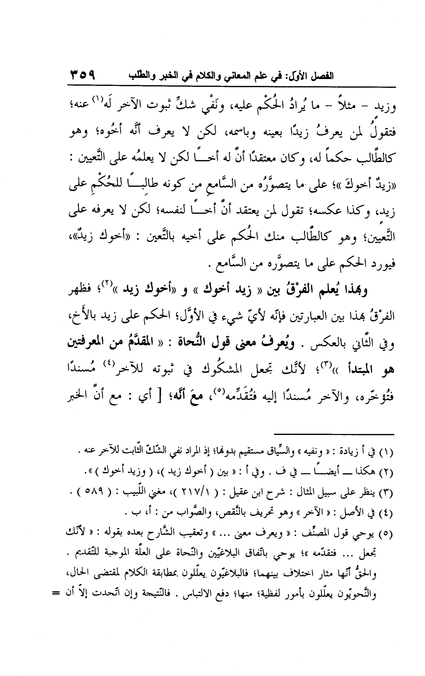 وبهذا يُعلم الفرْقُ بين "زيد أخوك" و "أخوك زيد" (¬2)؛ فظهر الفرْقُ بهذا بين العبارتين فإنّه لأيّ شيء في الأوَّل، الحكم على زيد بالأَخ، وفي الثَّاني بالعكس. ويُعرفُ معنى قول النُّحاة: "المقدَّمُ من المعرفتين هو المبتدأ" (¬3)؛ لأنَّك تجعل المشكُوك في ثبوته للآخر (¬4) مُسندًا فتُؤخّره، والآخر مُسندًا إليه فتُقَدِّمه (¬5)، معَ أنَّه؛ [أي: مع أنَّ الخبر
