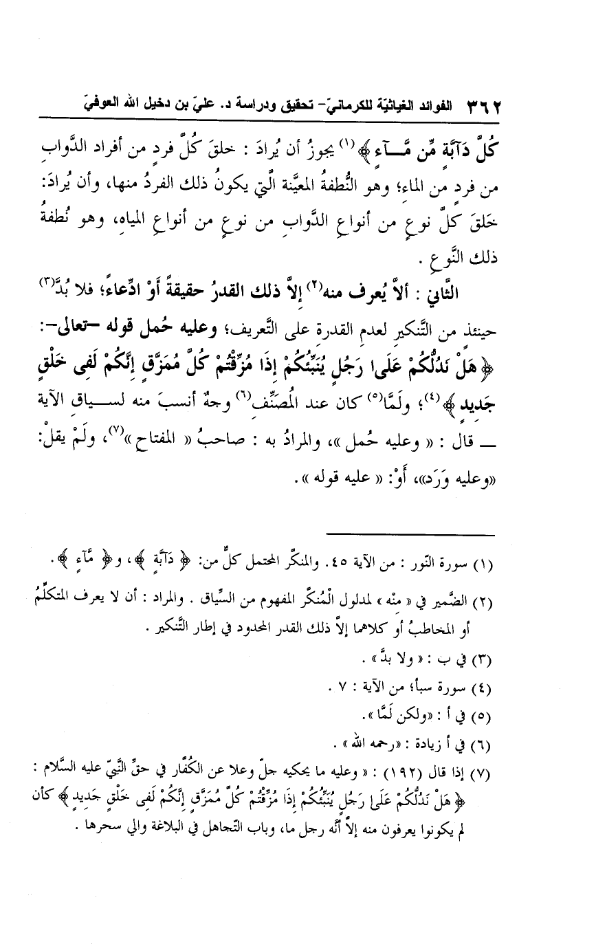 كُلَّ دَابَّةٍ مِنْ مَاءٍ} (¬1) يجوزُ أن يُرادَ: خلقَ كُلَّ فردٍ من أفراد الدَّوابِ من فردٍ من الماءِ؛ وهو النُّطفةُ المعيَّنة الَّتي يكونُ ذلك الفردُ منها، وأن يُرادَ: خَلقَ كلَّ نوعٍ من أنواعِ الدَّوابِ من نوعٍ من أنواعِ المياهِ، وهو نُطفةُ ذلك النَّوع.