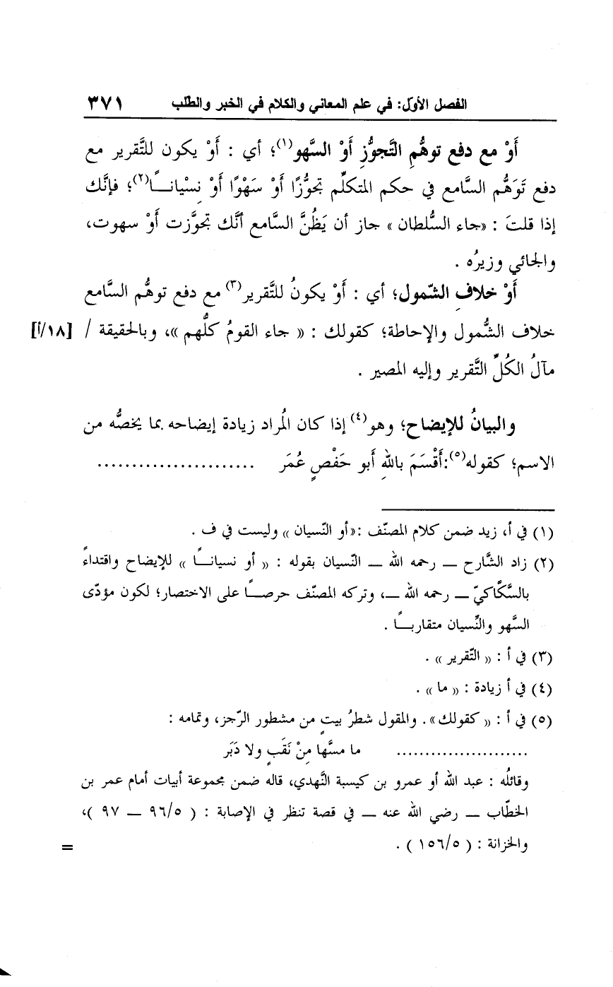(¬2) زاد الشَّارح -رحمه الله- النّسيان بقوله: "أو نسيانًا " للإيضاح واقتداءً بالسَّكَّاكيّ -رحمه الله-، وتركه المصنّف حرصًا على الاختصار؛ لكون مؤدّى السَّهو والنِّسيان متقاربًا.