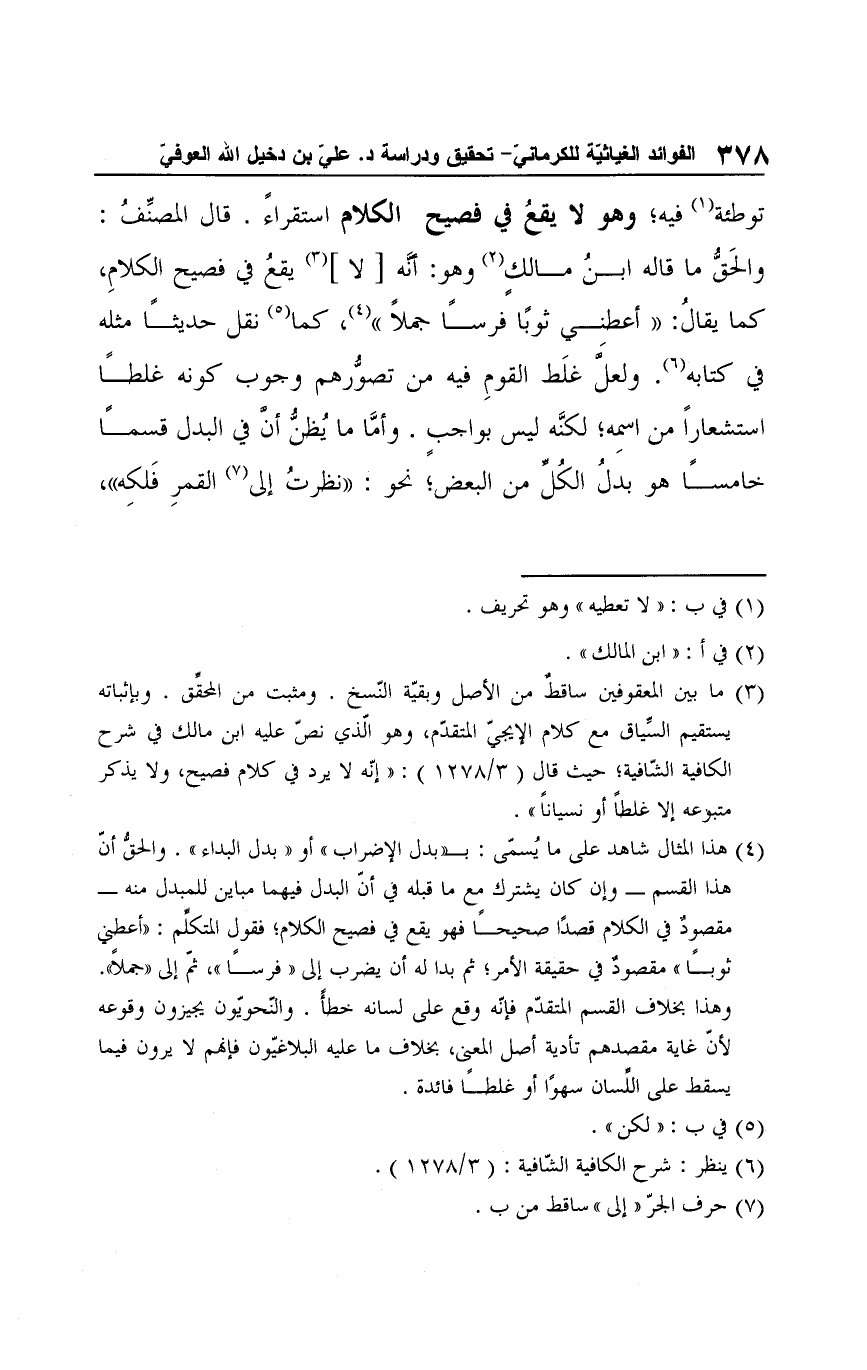 (¬4) هذا المثال شاهد على ما يُسمّى: بـ "بدل الإضراب" أو "بدل البداء". والحقُّ أنّ هذا القسم -وإن كان يشترك مع ما قبله في أنّ البدل فيهما مباين للمبدل منه- مقصودٌ في الكلام قصدًا صحيحًا فهو يقع في فصيح الكلام؛ فقول المتكلِّم: "أعطني ثوبًا" مقصودٌ في حقيقة الأمر؛ ثم بدا له أن يضرب إلى "فرسًا" ثمّ إلى "جملًا". وهذا بخلاف القسم المتقدّم فإنّه وقع على لسانه خطأ. والنّحويّون يجيزون وقوعه لأنّ غاية مقصدهم تأدية اُصل المعنى، بخلاف ما عليه البلاغيّون فإنهم لا يرون فيما يسقط على اللِّسان سهوًا أو غلطًا فائدة.