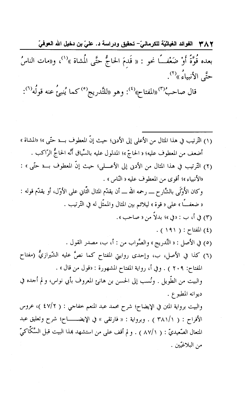 (¬1) التّرتيب في هذا المثال من الأعلى إلى الأدنى؛ حيث إنّ المعطوف بـ "حتّى"؛ "المشاة" أضعف من المعطوف عليه؛ "الحاجّ"؛ المدلول عليه بالسِّياق أَنَّه الحاجُّ الرّاكب.
