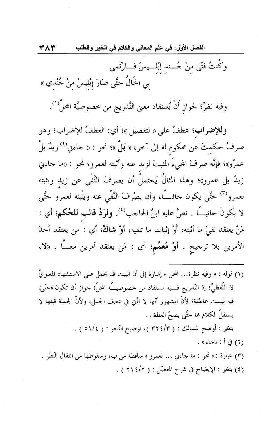 (¬1) قوله: "وفيه نظر؛ ... المحل" إشارة إلى أن البيت قد يحمل على الاستشهاد المعنويِّ لا اللّفظيِّ؛ إذ التّدريج فيه مستفاد من خصوصيّة المحلّ؛ لجواز أن تكون "حتّى" فيه ليست عاطفة؛ لأنّ المشهور أنّها لا تأتي في عطف الجمل، ولأنّ الجملة قبلها لا يستقلّ الكلام بها حتَّى يصحّ العطف.