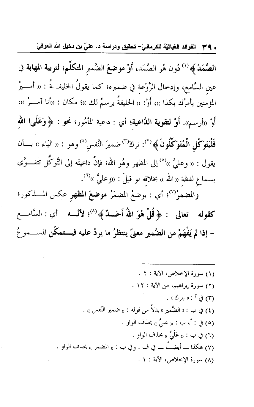 الصَّمَدُ} (¬1) دُون هُو الصَّمَد، أَوْ موضعَ الضَّميرِ المتكلِّم؛ لتربية المهابة في عينِ السَّامعِ، وإدخال الرَّوْعةِ في ضميره؛ كما يقولُ الخليفةُ: "أميرُ المؤمنين يأمرُك بكذا"، أَوْ: "الخليفةُ يرسمُ لك"، مكان: "أنا آمرُ"، أَوْ "أرسم". أَوْ لتقوية الدَّاعيةِ؛ أي: داعية المأمُور، نحو: {وَعَلَى اللَّهِ فَلْيَتَوَكَّلِ الْمُتَوَكِّلُونَ} (¬2): تركَ (¬3) ضميرَ النَّفسِ (¬4) وهو: "اليَاء" بأن يقول: "وعليَّ" (¬5) إلى المظهر وهُو الله؛ فإنَّ داعيتَه إلى التَّوكّل تتقوَّى بسماع لفظةِ "الله" بخلافِه لو قيلَ: "وعليَّ" (¬6).